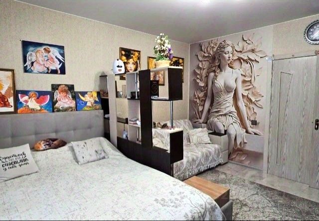 В спальне: вместительный шкаф, кровать, прикроватные тумбы. Квартира продается со всей мебелью, техникой и элементами декора.