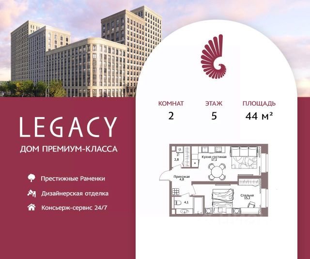 Продается двухкомнатная квартира общей площадью 50,4 м2 на 3 этаже дома премиум-класса Legacy в районе Раменки. Холл 4,5 м2 создает уют и комфорт с первых шагов. А правильно организованные встроенные системы хранения делают каждый квадратный метр холла продуманным и вместительным. Просторная кухня-гостиная 20.1 м2 для времяпровождения всей семьей за ужином, настольными играми или встреч с друзьями. Приватная спальная комната 20,8 м2, располагающая к отдыху и восстановлению сил. Для удобства будущих резидентов доступны два варианта отделки от застройщика: Premium и Elite премиальные материалы в отделке, мебель от европейских производителей, и освещение индивидуального изготовления. Жилой комплекс Legacy располагается на Мичуринском проспекте в районе с развитой инфраструктурой, богатой историей и высокой транспортной доступностью. Москва-река, Ботанический сад МГУ, главный корпус МГУ и Воробьевы горы на расстоянии прогулки от комплекса. Проект состоит из 9 секций переменной этажности от 8 до 17 этажей. В каждой секции не более 5 квартир на этаже, что обеспечивает высокий уровень приватности. Архитектура Проект Legacy разработан архитектурным бюро Speech. Его строгая лаконичность дополнена современными стандартами роскошной и комфортной жизни это бессменная классика, которая всегда вне моды. Благоустройство Свой приватный двор-сквер площадью 3 600 м2 с пространствами для всех возрастов: на территории располагаются игровые площадки, детский городок, песочница, воркаут-зоны, батуты, места для отдыха, лабиринты, настольный теннис и шахматные столы. Презентабельные лобби Дизайнерские лобби и холлы с премиальной отделкой. Изысканный стиль и высококачественные европейские материалы, отражающие высокий статус резидентов дома. Инфраструктура в доме Магазины, салон красоты, спортивная студия на первом этаже. А также ресторан Seasons, который позволяет разнообразить рацион и сделать каждый ужин особенным. Комфорт и безопасность Премиальный консьерж-сервис 24/7, круглосуточная охрана, видеонаблюдение, система СКУД, закрытый охраняемый паркинг и эксклюзивное мобильное приложение для решения бытовых вопросов резидентов. Купить 2-комнатную квартиру рядом с метро Раменки.