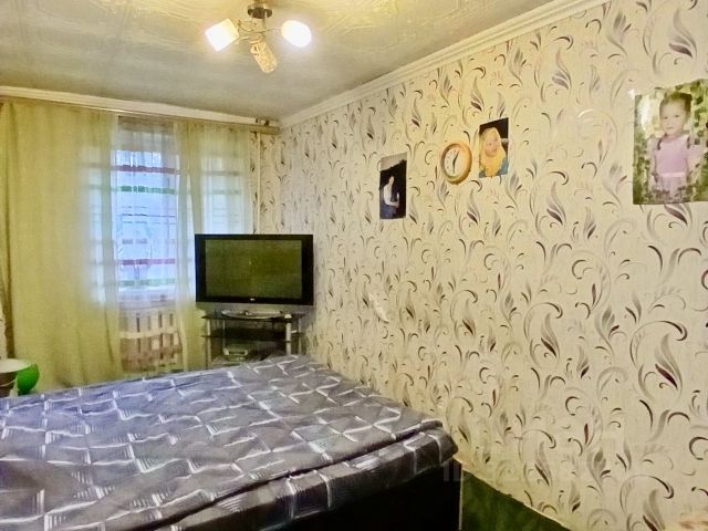 Гостиная разделена на две зоны: рабочая зона, для сна, а также зона отдыха для просмотра телевизора и просто отдыха (встроенная мебель также остается новому хозяину, нейтральный цвет подходит для детей любого пола), на полу гостиной ламинат, потолок подвесной.