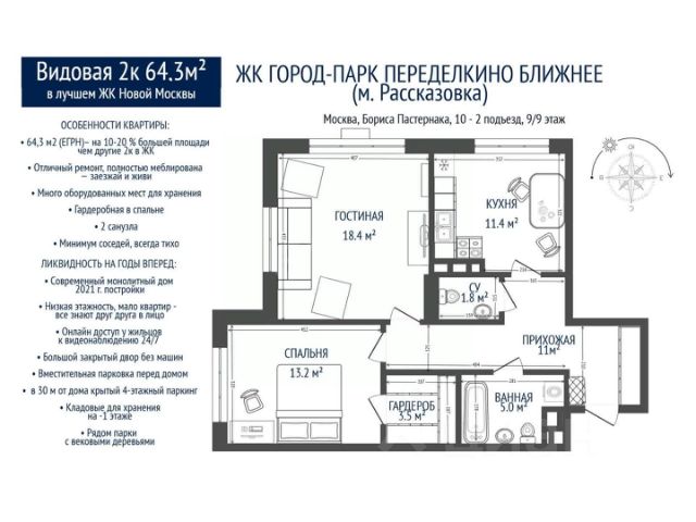 Продается двухкомнатная квартира в городе-парке "Переделкино Ближнее". Общая площадь квартиры - 40,6 кв. м, этаж 2 из 17. Срок сдачи - 1 квартал 2028 года. Тип дома - монолитный. Корпус расположен в новой 13 фазе строительства и состоит из 8 секций с переменной этажностью 12-17 этажей. Все секции без отделки. Около 13 фазы запланировано строительство многоуровневого паркинга на 300 м/мест. 13 фаза имеет уникальное расположение и находится непосредственно на берегу Федосьинского пруда, который является сердцем города-парка "Переделкино Ближнее". Город-парк "Переделкино Ближнее" расположен в 8 км от МКАД по Боровскому шоссе. ТРАНСПОРТНАЯ ДОСТУПНОСТЬ: - 15 минут пешком до станции МЦД-4 "Мичуринец" - 25 минут пешком до станции метро "Рассказовка" Солнцевской линии - 30 минут до центра Москвы - 2026 г. - открытие трассы Солнцево-Бутово-Варшавское шоссе РАЗВИТАЯ СОЦИАЛЬНАЯ ИНФРАСТРУКТУРА: - 7 детских садов, 3 школы - банки, продуктовые магазины, аптеки, фитнес центры, салоны красоты и пр БЛАГОУСТРОЙСТВО: - дворы без машин - игровые зоны и развивающие детские площадки - зоны для созерцательного и медитативного отдыха - зоны для занятий спортом ОСОБЕННОСТИ АРХИТЕКТУРЫ: - высокие потолки от 3,03 м - безбарьерные входные группы - колясочные в каждой входной группе - кладовые помещения расположены на -1 этаже каждой секции - в каждой секции 2 лифта: 1 пассажирский, 1 грузовой - на фасаде предусмотрены корзины для установки кондиционеров АВТОРСКИЙ ДИЗАЙН: Входные группы выполнены по авторскому дизайну, благодаря панорамному остеклению наполнены естественным светом. В каждой входной группе будет располагаться комфортабельная зона ожидания с возможностью зарядить электронные устройства, почтовые ящики, колясочная, акцентные пуфы и столик. Купить 2-комнатную квартиру рядом с метро Рассказовка.