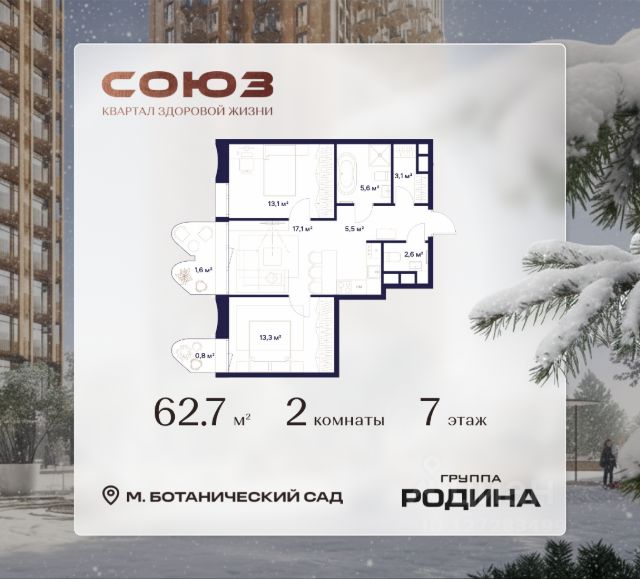 Рассрочка 0% Продаётся 2-комнатная квартира площадью 61.7 м² на 5 этаже в Жилом Комплексе "Союз". Квартал здоровой жизни премиум-класса с рекордным количеством олимпийских видов спорта: - Ледовая арена для хоккея и фигурного катания, - Футбольные поля для тренировок, - Спортивный зал для фехтования, - Бассейн на 6 дорожек, - Центр единоборств, - 4 крытых площадки для настольного тенниса, - 7 теннисных кортов (крытых и открытых), - 4 крытых площадки для сквоша, - Легкоатлетический стадион, - Площадки для баскетбола и волейбола. Уникальные форматы квартир с мастер-спальнями, приватными террасами, балконами, а также пентхаусы с открыточными видами на город. Все квартиры продаются с отделкой Shell&Core и панорамным остеклением. Расположение Пешком: - 2 мин. до парка "Сад Будущего"; - 6 мин. до ст. м. "Ботанический сад"; - 6 мин. до ст. МЦК "Ботанический сад"; - 6 мин. до парка "Леоновская роща"; На автомобиле: - 2 мин. до СВХ (МСД); - 5 мин. до Проспекта Мира; - 10 мин. до ТТК; - 15 мин. до Садового кольца; - 25 мин. до аэропорта "Шереметьево". Благоустройство - собственная спортивная инфраструктура 7 Га; - зона для пикников; - игровые и спортивные площадки для детей всех возрастов; - розарий, а также сосновые, каштановые и дубовые аллеи; - площадки под открытым небом для занятий спортом и йоги; - игровые комнаты для детей; - лаунж-зона для резидентов; - просторная переговорная для деловых встреч; - премиальный ресторан "Шабада" Сосо Павлиашвили с водными арт-объектами на прогулочной аллее, садом ароматных трав и сценой под открытым небом; - кафе, химчистки, аптеки и супермаркеты рядом с домом. Окружение - 8 парков: Сад Будущего, Леоновская роща, Хуамин, Главный ботанический сад РАН, Шереметьевская дубрава, Останкино, парк спорта "Яуза", пойма реки Яуза и музей-усадьба "Останкино"; - 3 ВУЗа: ВГИК, РГСУ, МГПУ; - 12 школ, в том числе: школа 1499 им. И.А. Докукина (топ 100), Brookes Moscow, IThub школа; - 18 детских садов, в том числе билингвальный ALERTUM KIDS; - один из крупнейших океанариумов Европы "Москвариум"; - один из крупнейших в Европе торгово-развлекательных центров "Европолис". Продам 2-комнатную квартиру рядом с метро Свиблово.