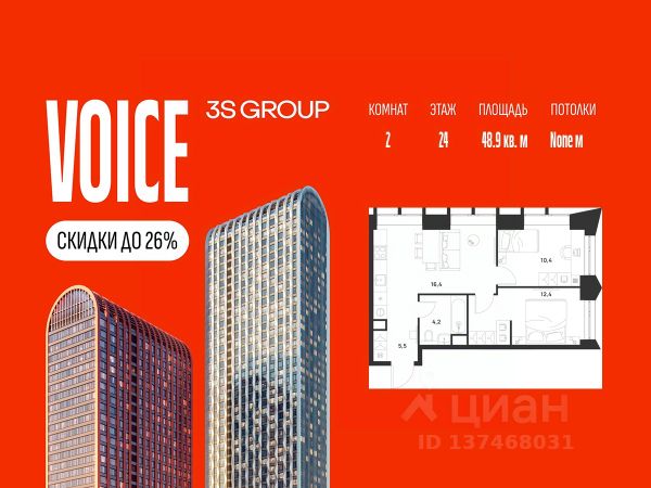 Ипотека от 3,5% на весь срок. Дополнительная скидка в офисе продаж! Продается уютная 2-комн. квартира площадью 48,9 кв.м на 24 этаже жилого комплекса бизнес-класса Voice Towers от 3S Group. Общая площадь: 48,9 кв.м., жилая: 32 кв.м., площадь кухни-гостиной: 16,2 кв.м., высокие потолки: 3,12 м., санузел совмещенный. О проекте: Voice. Высокие стандарты жизни Мы уверены, что высокие идеалы неизменно помогают достигать высот. Создавая Voice, мы ориентировались на людей с высокими требованиями к качеству и безупречным вкусом. Башни жилого комплекса, сочетают элегантную форму с динамичной геометрией фасадов, устремляются ввысь и отвечают самым высоким стандартам строительства. Технологичность, воплощенная в архитектуре - это ваш, собственный Voice. Преимущества локации Близость к метро Текстильщики, БКЛ и МЦК Новохохловская (10 мин) Рядом природный заповедник и конно-спортивная база Кузьминки-Люблино Будущее окружение Проект Южный порт - Текстильщики с деловым центром Сити-2 Небоскребы высотой до 300м Культурный центр с амфитеатром Променад вдоль Москвы-реки и яхт-клуб Архитектура Проект от Архитектурной мастерской Алексея Ильина Две перпендикулярные башни с арочными вершинами Высокая башня: светло-серый металл Низкая башня: терракотовая керамика Благоустройство Внешняя зона: парковки, магазины, кафе Внутренний двор: закрытая территория с озеленением Шумозащитный экран Сезонное озеленение Встречи на высоте Гранд-лобби высотой 8м Дизайнерская мебель Умные скоростные лифты Услуги Детский центр с игровой зоной Фитнес-студия для жителей