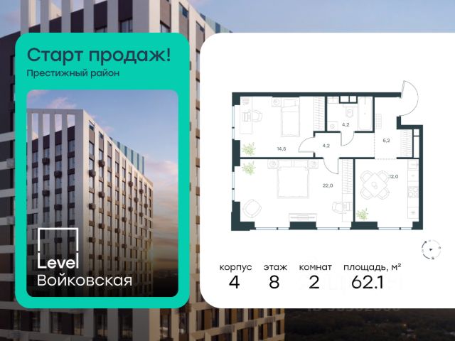 Цена указана с учётом скидки при 100%-й оплате, несубсидированной ипотеке, рассрочке (кроме программы "Рассрочка 0%"). Продается 2-комнатная квартира площадью 62.10 кв. м с отделкой. Квартира находится на 8 этаже 26-этажного корпуса 4, в новом жилом комплексе бизнес-класса Level Войковская, расположенном рядом с живописным заповедником "Покровское-Стрешнево" (застройщик - компания Level Group/Левел групп). Прекрасная транспортная доступность - 7 мин. пешком до станции МЦК "Балтийская"; - 15 мин. пешком до станции метро "Войковская"; - 8 мин. на машине до ТТК; - 15 мин. на машине до центра Москвы; - 20 мин. на машине до Москва-Сити. Продуманный архитектурный проект - стильная архитектура от мастерской Фефелова В. В.; - панорамные виды на парки, Химкинское водохранилище и Останкинскую башню; - лобби с высотой потолков до 6,45 метров; - более 20 видов планировочных решений, включая редкие форматы квартир с террасой и увеличенной высотой потолков до 5,42 метров; - 2 варианта дизайнерской отделки в корпусе 4, предлагаются как дополнительная опция к отделке white box: стиль Modern в светлых холодных тонах и стиль Classic в нейтральной бежевой гамме. Квартиры в корпусах 3 и 5 сдаются без отделки. Расположение Level Войковская строится в престижном Северном округе Москвы. Развитая инфраструктура и живописная природа переплетаются в единый ансамбль, столь значимый для комфортной жизни. Войковский район окружают парки и набережные. В шаговой доступности - парк "Покровское-Стрешнево", не более 15-ти минут на велосипеде занимает путь до Тимирязевского парка и 9-ти минут до парка усадьбы Михалково. Рядом более 60 школ, 75 дошкольных учреждений, 17 государственных и 6 частных вузов, 25 супермаркетов, 4 торговых центра, среди которых ТЦ "Метрополис" и ТЦ "Авиапарк". Внутренняя инфраструктура На территории жилого комплекса предусмотрены коммерческие помещения: кафе, ресторан, пекарня и другие сервисы откроются на первых этажах корпусов. Для жителей будет доступен отапливаемый подземный паркинг на 244 машино-места с доступом с любого этажа на лифте. На территории паркинга будет расположено 125 кладовых помещений для хранения сезонного инвентаря. Лобби и благоустройство Дизайн лобби Level Войковская создан совместно с бюро BLANK. Это уютные гостиные, где хочется задержаться. Теплая цветовая гамма, ресепшен, зоны ожидания, лапомойки и гостевые санузлы - каждая деталь превращает лобби в комфортное продолжение вашего дома. 1,15 га площади в первых двух этапах строительства отведено под приватный внутренний двор, который спроектирован совместно с бюро "Правда". Детские площадки для всех возрастов, спортивные пространства для йоги, воркаута и петанка, уютные зоны для тихого отдыха или работы. Здесь утро начинается с вдохновения, а вечер наполнен приятными моментами. Лифты Комфортное перемещение внутри жилого комплекса будут обеспечивать надёжные лифты с доступом в паркинг с жилых этажей. В каждом корпусе предусмотрено по 3 грузопассажирских лифта. 2-комнатная квартира рядом с метро Войковская.