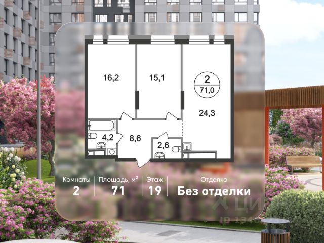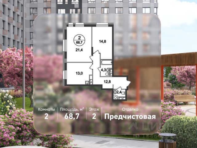 Продается двухкомнатная квартира без отделки в 11 квартале города-парка "Первый Московский". Общая площадь квартиры - 68,3 кв. м, этаж 22 из 22. Планируемый срок ввода в эксплуатацию - 3 квартал 2029 года. Тип дома - монолитный. Город-парк "Первый Московский" расположен всего в 7 км по Киевскому шоссе от МКАД на территории Новой Москвы. Из города-парка прямой выезд на Киевское шоссе и трассу Солнцево-Бутово-Варшавское шоссе. ТРАНСПОРТНАЯ ДОСТУПНОСТЬ: - 7 мин. на личном автомобиле или 10 мин. на автобусе до станции метро "Филатов Луг" - 10 мин. на автомобиле или 20 мин. на автобусе до станции метро "Рассказовка" или "Саларьево" ПРЕИМУЩЕСТВА 6 КОРПУСА: - живописные виды на Ульяновский лесопарк - 1 секция - входная группа с безбарьерным входом - просторная колясочная - 4 лифта: 2 пассажирских, 2 грузовых - на 1 этаже расположены коммерческие помещения - на -1 и жилых этажах запроектированы кладовые помещения - обеспеченность машино-местами: гостевой паркинг 48 м/м, многоуровневые паркинги рядом с домом ВНУТРЕННЯЯ ИНФРАСТРУКТУРА И БЛАГОУСТРОЙСТВО: Дома 11 квартала граничат с Ульяновским лесопарком. Вся территория 11 квартала имеет 2 типа пространств: - приватное дворовое пространство с детскими игровыми и спортивными площадками. Дворы свободны от машин. - прогулочные маршруты с зонами отдыха. Прогулочный маршрут объединяет дома 11 квартала в единое пространство, благодаря оригинальной геопластике создаётся уникальный разноуровневый ландшафтный узор. РАЗВИТАЯ ИНФРАСТРУКТУРА В ОКРУЖЕНИИ: - общеобразовательная школа 2120 корпус ш3 (всего в проекте 5 школ) - детский сад 2120 корпус д4 (всего в проекте 8 детских садов) - школа искусств - поликлиника - торговый центр "Столица" - кафе, продуктовые магазины, аптеки, фитнес центры, салоны красоты и пр. - в пешей доступности благоустроенный парк "Филатов Луг"