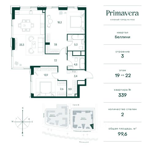 Клубный город на реке Primavera — это современный жилой комплекс премиум-класса, расположенный на первой береговой линии Москвы-реки в экологически чистом районе Покровское-Стрешнево. Под панорамными окнами квартир находится собственный экопарк с продуманной сетью прогулочных дорожек и современными детскими и спортивными площадками. За парком расположена набережная с собственным пляжем и зонами для отдыха. Клубный город на реке Primavera предлагает широкий выбор планировок для различных жизненных сценариев: от просторных однокомнатных квартир до пентхаусов и жилых помещений с террасами и патио. Выберите из 120 вариантов эргономичных планировок стандартного и евроформата. Из каждой квартиры открываются красивые виды на реку с углом обзора в 270 градусов. Дизайнерские лобби предлагают панорамный обзор на благоустроенный двор. Высокие потолки в 6 метров и качественная отделка создают атмосферу, схожую с пятизвездочными отелями. В Primavera есть всё необходимое для комфортной жизни в мегаполисе: • Образование для детей в шаговой доступности: 4 школы, 8 детских садов и развивающие центры с кружками и секциями. • Удобства на расстоянии приятной прогулки: супермаркеты, кафе, рестораны с верандами, салоны красоты, аптеки и многофункциональный центр для шоппинга и развлечений. • Умный дом: автоматизированное бесконтактное управление основными системами доступа и безопасности через мобильное приложение. Клубный город на реке Primavera выгодно сочетает комфорт городской жизни с близостью к природе. Живите в месте, где все создано для вашего удобства! 2-комнатная квартира в районе Покровское-Стрешнево в Москве.