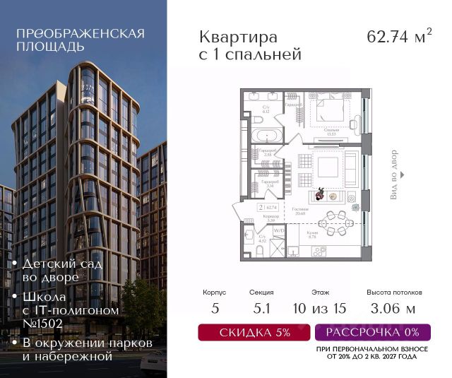 Квартира расположена в секции 5, окна выходят во внутренний двор.