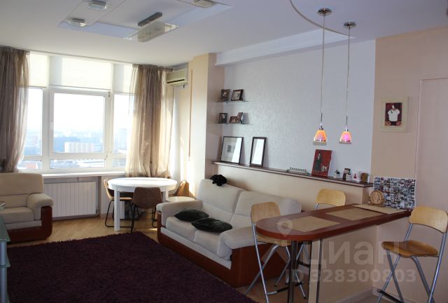Площадь квартиры 50,5 кв.м (по факту двухкомнатная квартира). Просторная гостиная-столовая и изолированная спальня с лоджией, откуда открывается потрясающий вид на Москву. Лоджия утеплена, тройные немецкие стеклопакеты, теплый пол. Функциональная встроенная кухня - с холодильником, посудомоечной машиной, электроплитой, оснащена современной барной стойкой. В комнате панорамные окна, высота потолков 3 метра, что делает комнату просторной и светлой. В квартире комбинированное освещение. Внушительный холл с огромным шкафом купе. Санузел просторный, глубокая ванная. В доме потрясающая шумоизоляция, хоть приглашай в гости симфонический оркестр с дирижером. Имеющаяся в квартире мебель, при желании нового владельца, останется в подарок.