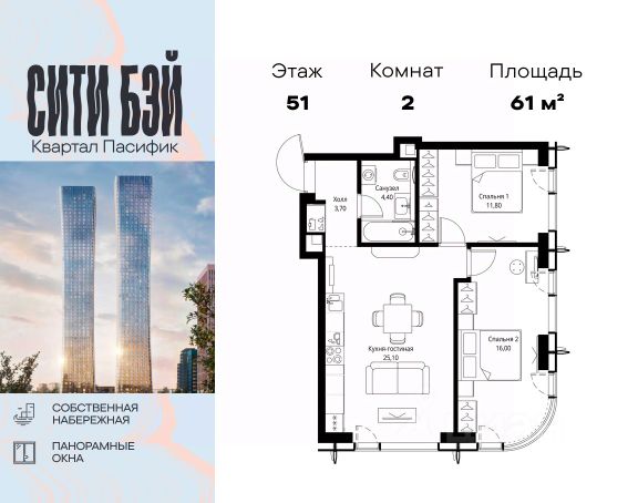 Прямая продажа от застройщика. Продаётся 2-комнатная квартира общей площадью 58.50 м² без отделки в ЖК Сити Бэй, квартале Пасифик, на 8-м этаже 59 этажного дома. Концепция жилого комплекса Сити Бэй - настоящий город в городе с отлично развитой инфраструктурой и собственной благоустроенной набережной. На территории жилого комплекса расположено пять кварталов - Атлантик, Пасифик, Индиан, Норс, Клиф. Жилой квартал Сити Бэй отличается оригинальной концепцией и выделяется среди других проектов такими характеристиками как: - Архитектура, - Виды из окон, - Природное окружение, вызывая гордость у жителей и восхищение у прохожих. Вся жизнь района Покровское-Стрешнево строится вокруг водных объектов: - Пойма реки Сходни с уникальной экосистемой, - Речка Химка и Химкинское водохранилище, - Москва-река, - Канал имени Москвы. Кругом вода, и местные с удовольствием этим пользуются. А сразу за рекой - центр водного спорта в Строгино с вейк-парком и яхт-клубами. Помимо воды, здесь очень много зелени: - Рядом Сходненский ковш памятник природы, естественный амфитеатр глубиной 40 метров; - Парк при усадьбе Братцево с фруктовым садом; - Дубовая роща "Маяк", - Алешкинский лес; - Лесопарк Покровское-Стрешнево с пляжами и бобрами. Главные транспортные артерии района: - Волоколамское шоссе, - Таганско-Краснопресненская линия метро и МЦД-2. Всего за 20 минут можно добраться до центра на машине или метро, а МЦД связывает ЖК Сити Бэй с северными, восточными и юго-восточными районами. Компания MR предлагает своим клиентам специальные условия приобретения квартир в рамках программ ипотечного кредитования от банков-партнеров.