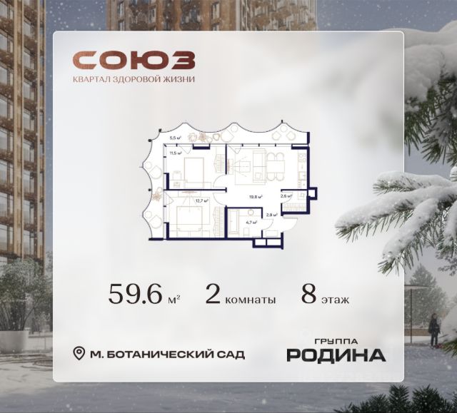 Продается евродвушка в ЖК Триколор. Общая площадь 60,4 м2, с большой кухней-гостиной 25 м2 и ванной 7,5 м2.