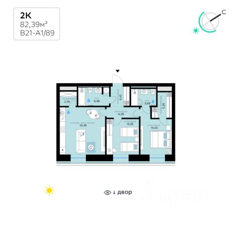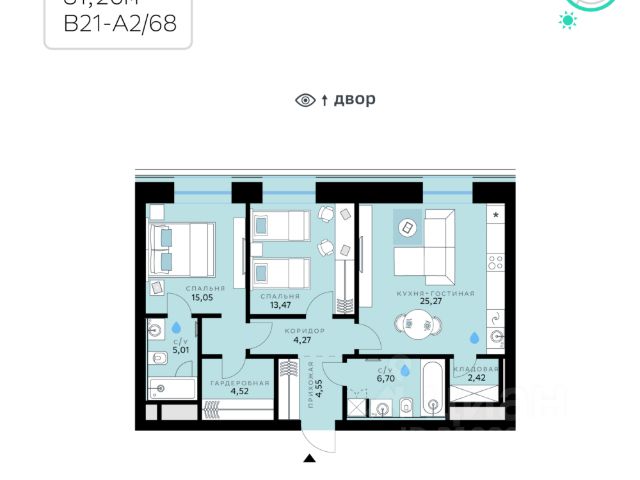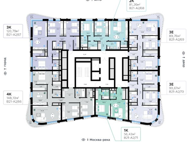 В продаже — двухкомнатная квартира, общей площадью 79 кв. м. Квартира расположена на пятом этаже шестиэтажного корпуса класса Балансд в квартале В17 нового района СберСити, который строит Сбер. Квартал В17 — современная интерпретация голландской архитектуры. Каждый корпус имеет индивидуальный облик. Фасады домов класса Балансд облицованы кирпичом и клинкерной плиткой, над первым этажом проходит декоративный пояс из фигурной кладки. Французские балкончики чередуются с широкими окнами, создавая динамичный, но гармоничный ритм. Квартира сдаётся без отделки. Установлены двухкамерные стеклопакеты с алюминиевым профилем и скрытыми створками. Высота потолков — от 2,7 м. В квартирах предустановлена система "умный дом" — комплекс решений, объединяющий квартиру, дом и прилегающую территорию. Жильцы смогут регулировать климат и освещение голосом или со смартфона, установить защита от протечек. Квартал В17 состоит из шести корпусов переменной этажности (от 1 до 10 этажей) и 491 квартиры. Корпуса объединены общей подземной частью, где расположен паркинг на 309 автомобилей, места для мотоциклов и более 400 кладовых помещений. На первом этаже дома — уютное лобби, лапомойка, колясочная и велосипедная комната. Во дворах созданы приватные благоустроенные пространства с ландшафтными композициями, детскими и спортивными площадками, зоной для йоги и маршрутами для прогулок. Рядом расположены детский сад, парк и набережная Москвы-реки. СберСити — это новый жилой и деловой район на западе Москвы, в одном из самых экологически чистых и престижных мест столицы. Это первая в России и крупнейшая в мире инновационная городская среда, созданная по международным стандартам зелёного проектирования. Здесь внедряются решения в области энергоснабжения, вакуумного мусороудаления, тестирования зелёных технологий, а в дальнейшем — системы искусственного интеллекта для управления домами и городской инфраструктурой. Строительство проекта началось в 2021 году, заселение первых корпусов — с лета 2024-го. Общая площадь территории — 461 га, из них более 2,5 млн кв. м жилья и около 833 тыс. кв. м офисных пространств. Будет построено 7 школ, 13 детских садов и 2 поликлиники. В СберСити будут жить 65 тыс. человек и работать 70 тыс. Развитием территории занимается АО "Рублёво-Архангельское", входящее в группу Сбер. СберСити — место, где хочется жить, работать и растить детей. Переезжайте в СберСити!