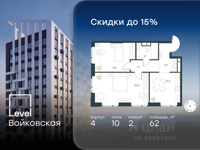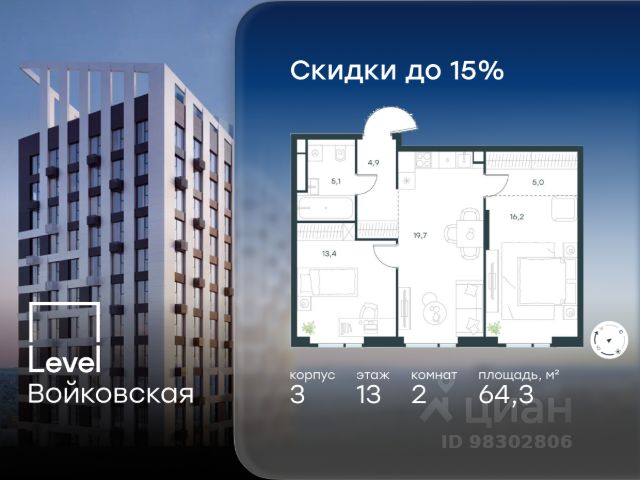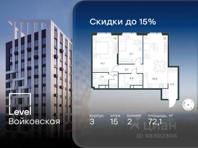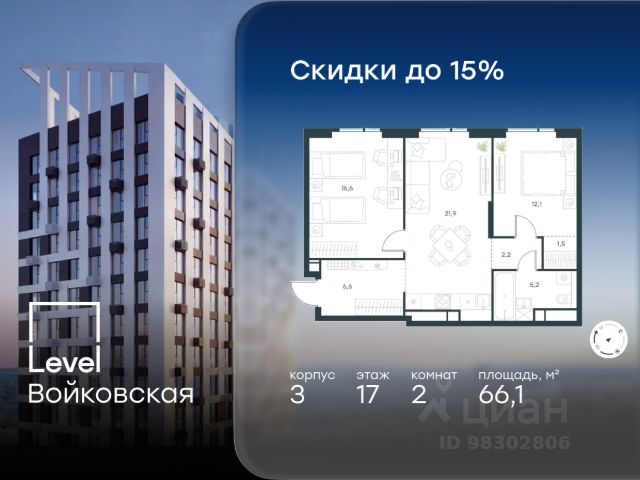 Цена указана с учётом скидки при 100%-й оплате, несубсидированной ипотеке, рассрочке (кроме программы "Рассрочка 0%"). Продается 2-комнатная квартира площадью 70.30 кв. м без отделки. Квартира находится на 15 этаже 20-этажного корпуса 3, в новом жилом комплексе бизнес-класса Level Войковская, расположенном рядом с живописным заповедником "Покровское-Стрешнево" (застройщик - компания Level Group/Левел групп). Прекрасная транспортная доступность - 7 мин. пешком до станции МЦК "Балтийская"; - 15 мин. пешком до станции метро "Войковская"; - 8 мин. на машине до ТТК; - 15 мин. на машине до центра Москвы; - 20 мин. на машине до Москва-Сити. Продуманный архитектурный проект - стильная архитектура от мастерской Фефелова В. В.; - панорамные виды на парки, Химкинское водохранилище и Останкинскую башню; - лобби с высотой потолков до 6,45 метров; - более 20 видов планировочных решений, включая редкие форматы квартир с террасой и увеличенной высотой потолков до 5,42 метров; - 2 варианта дизайнерской отделки в корпусе 4, предлагаются как дополнительная опция к отделке white box: стиль Modern в светлых холодных тонах и стиль Classic в нейтральной бежевой гамме. Квартиры в корпусах 3 и 5 сдаются без отделки. Расположение Level Войковская строится в престижном Северном округе Москвы. Развитая инфраструктура и живописная природа переплетаются в единый ансамбль, столь значимый для комфортной жизни. Войковский район окружают парки и набережные. В шаговой доступности - парк "Покровское-Стрешнево", не более 15-ти минут на велосипеде занимает путь до Тимирязевского парка и 9-ти минут до парка усадьбы Михалково. Рядом более 60 школ, 75 дошкольных учреждений, 17 государственных и 6 частных вузов, 25 супермаркетов, 4 торговых центра, среди которых ТЦ "Метрополис" и ТЦ "Авиапарк". Внутренняя инфраструктура На территории жилого комплекса предусмотрены коммерческие помещения: кафе, ресторан, пекарня и другие сервисы откроются на первых этажах корпусов. Для жителей будет доступен отапливаемый подземный паркинг на 244 машино-места с доступом с любого этажа на лифте. На территории паркинга будет расположено 125 кладовых помещений для хранения сезонного инвентаря. Лобби и благоустройство Дизайн лобби Level Войковская создан совместно с бюро BLANK. Это уютные гостиные, где хочется задержаться. Теплая цветовая гамма, ресепшен, зоны ожидания, лапомойки и гостевые санузлы - каждая деталь превращает лобби в комфортное продолжение вашего дома. 1,15 га площади в первых двух этапах строительства отведено под приватный внутренний двор, который спроектирован совместно с бюро "Правда". Детские площадки для всех возрастов, спортивные пространства для йоги, воркаута и петанка, уютные зоны для тихого отдыха или работы. Здесь утро начинается с вдохновения, а вечер наполнен приятными моментами. Лифты Комфортное перемещение внутри жилого комплекса будут обеспечивать надёжные лифты с доступом в паркинг с жилых этажей. В каждом корпусе предусмотрено по 3 грузопассажирских лифта. Купить 2-комнатную квартиру станция Балтийская (МЦК).
