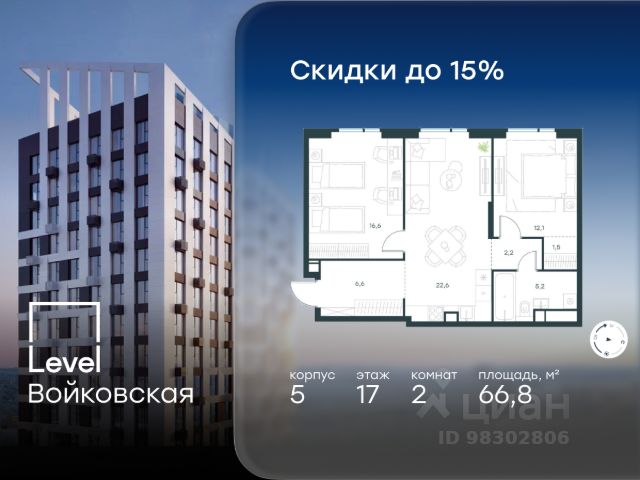 Цена указана с учётом скидки при 100%-й оплате, несубсидированной ипотеке, рассрочке (кроме программы "Рассрочка 0%"). Продается 2-комнатная квартира площадью 62.80 кв. м с отделкой. Квартира находится на 19 этаже 26-этажного корпуса 4, в новом жилом комплексе бизнес-класса Level Войковская, расположенном рядом с живописным заповедником "Покровское-Стрешнево" (застройщик - компания Level Group/Левел групп). Прекрасная транспортная доступность - 7 мин. пешком до станции МЦК "Балтийская"; - 15 мин. пешком до станции метро "Войковская"; - 8 мин. на машине до ТТК; - 15 мин. на машине до центра Москвы; - 20 мин. на машине до Москва-Сити. Продуманный архитектурный проект - стильная архитектура от мастерской Фефелова В. В.; - панорамные виды на парки, Химкинское водохранилище и Останкинскую башню; - лобби с высотой потолков до 6,45 метров; - более 20 видов планировочных решений, включая редкие форматы квартир с террасой и увеличенной высотой потолков до 5,42 метров; - 2 варианта дизайнерской отделки в корпусе 4, предлагаются как дополнительная опция к отделке white box: стиль Modern в светлых холодных тонах и стиль Classic в нейтральной бежевой гамме. Квартиры в корпусах 3 и 5 сдаются без отделки. Расположение Level Войковская строится в престижном Северном округе Москвы. Развитая инфраструктура и живописная природа переплетаются в единый ансамбль, столь значимый для комфортной жизни. Войковский район окружают парки и набережные. В шаговой доступности - парк "Покровское-Стрешнево", не более 15-ти минут на велосипеде занимает путь до Тимирязевского парка и 9-ти минут до парка усадьбы Михалково. Рядом более 60 школ, 75 дошкольных учреждений, 17 государственных и 6 частных вузов, 25 супермаркетов, 4 торговых центра, среди которых ТЦ "Метрополис" и ТЦ "Авиапарк". Внутренняя инфраструктура На территории жилого комплекса предусмотрены коммерческие помещения: кафе, ресторан, пекарня и другие сервисы откроются на первых этажах корпусов. Для жителей будет доступен отапливаемый подземный паркинг на 244 машино-места с доступом с любого этажа на лифте. На территории паркинга будет расположено 125 кладовых помещений для хранения сезонного инвентаря. Лобби и благоустройство Дизайн лобби Level Войковская создан совместно с бюро BLANK. Это уютные гостиные, где хочется задержаться. Теплая цветовая гамма, ресепшен, зоны ожидания, лапомойки и гостевые санузлы - каждая деталь превращает лобби в комфортное продолжение вашего дома. 1,15 га площади в первых двух этапах строительства отведено под приватный внутренний двор, который спроектирован совместно с бюро "Правда". Детские площадки для всех возрастов, спортивные пространства для йоги, воркаута и петанка, уютные зоны для тихого отдыха или работы. Здесь утро начинается с вдохновения, а вечер наполнен приятными моментами. Лифты Комфортное перемещение внутри жилого комплекса будут обеспечивать надёжные лифты с доступом в паркинг с жилых этажей. В каждом корпусе предусмотрено по 3 грузопассажирских лифта. Купить 2-комнатную квартиру станция Балтийская (МЦК).