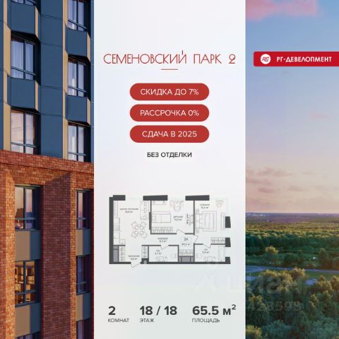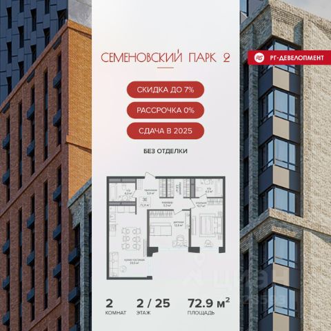Ипотека для каждого! Полная стоимость кредита от 11,578% до 22,490%. Ставка от 0,11% в АО "Альфа-Банк" фиксируется на 1 год с даты заключения кредитного договора, далее полная стоимость кредита от 25,819% до 28,767% ставка 25,39% до окончания срока кредитования. Первоначальный взнос — от 20% от стоимости квартиры. Срок кредитования — от 3 до 30 лет. Ипотека на весь срок! Полная стоимость кредита от 23,396% до 26,058% со ставкой 15%! Первоначальный взнос —от 20,01% от стоимости квартиры. Срок кредитования — от 3 до 30 лет. АО "Банк ДОМ.РФ" универсальная лицензия Банка России 2312 от 19.12.2018. Скидка 7% при покупке квартиры! Цена указана с учетом максимального размера скидки. Продается 2-к квартира 72,9 кв.м. в ЖК "Семеновский парк 2" на 2-м этаже 25 этажного дома. Компания "РГ-Девелопмент" предоставляет скидки на квартиры в жилом комплексе. Акция действительна с 12.09.24 г. до 31.10.25г. включительно. Чтобы воспользоваться предложением, необходимо подписать договор на приобретение недвижимости до 31.10.25г., включительно. Скидка 5% + Рассрочка 0% При приобретении дольщиком квартиры с использованием способа оплаты "Рассрочка 0%", у покупателя также есть право воспользоваться скидкой в размере 5% от полной стоимости квартиры. Условия программы рассрочки: Первый платеж составляет 20% от стоимости объекта и вносится при заключении ДДУ. Второй платеж в размере 20% от стоимости объекта вносится по истечении 6 месяцев со дня подписания ДДУ. Оставшаяся сумма, в размере 60%, выплачивается за месяц до планового срока ввода ЖК в эксплуатацию, то есть не позднее 30.11.2025. Прямая продажа от застройщика! Квартиры без отделки. Срок сдачи корпуса - 4 кв. 2025 г. ЖК "Семеновский парк 2" - это идеальное место для того, чтобы стать вашим домом. Проект расположен в исторической части Москвы вблизи Измайловского лесопарка, в 1 км от ЦАО. 4 станции метро отделяют вас от Красной площади и 15 минут на автомобиле - от Садового кольца. Купить 2-комнатную квартиру станция Измайлово (МЦК).