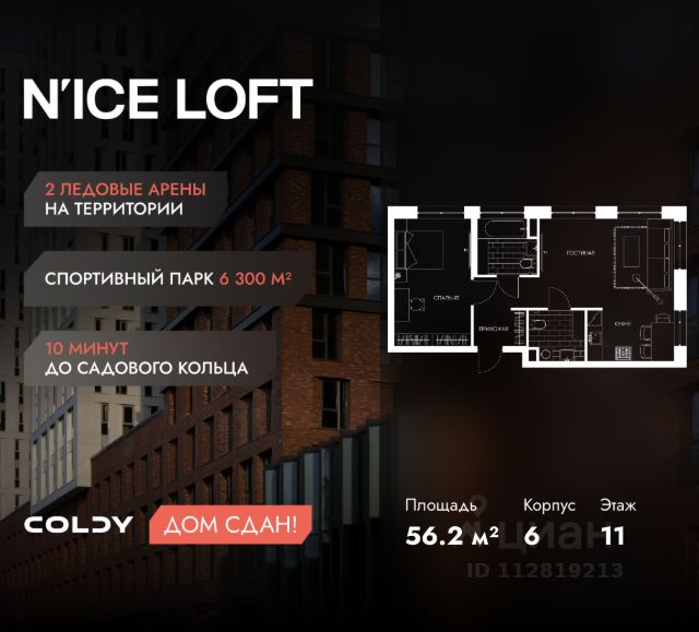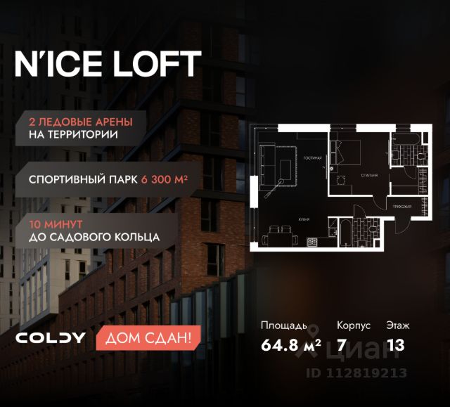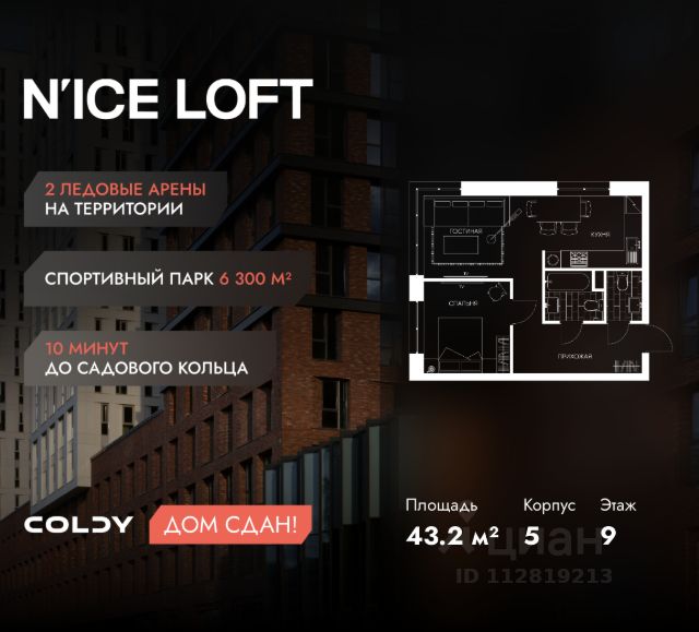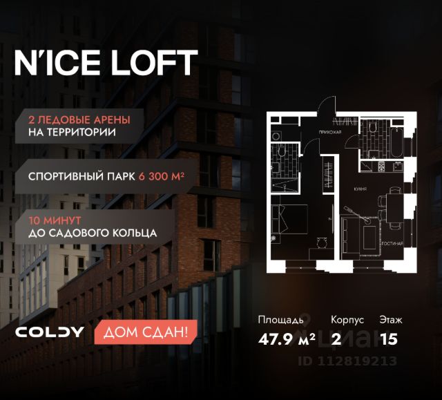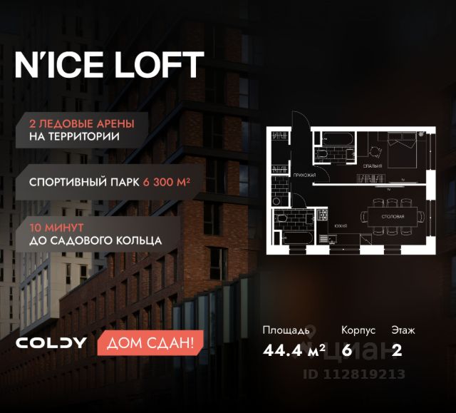 NICE LOFT — готовый жилой квартал с собственным спортивным кластером в 10 минутах от Садового кольца Комплекс апартаментов бизнес-класса NICE LOFT, девелопером которого выступила компания Coldy, представляет собой знаковое жилое пространство, на территории которого органично объединены высококачественная инфраструктура для комфортной жизни и полноценный спортивный кластер. NICE LOFT — новая спортивная доминанта Москвы, где для жителей и их гостей предусмотрено более 20 000 м², созданных специально для тренировок, игр, восстановления и оздоровления. Автором выразительной городской эстетики выступило архитектурное бюро APEX. Строгие силуэты фасадов эффектно возвышаются над благоустроенным окружением, а световые блики элегантно подчеркивают структурное фасадное остекление. Сердце проекта — физкультурно-оздоровительный комплекс с двумя ледовыми аренами формата НХЛ — профессиональными площадками. Помимо спортивных арен на территории NICE LOFT предусмотрено пять многофункциональных залов, где каждый, сможет реализовать свой спортивный потенциал. Для тех, кто предпочитает тренировки и прогулки на свежем воздухе, создан спортивный парк общей площадью 6 300 м² с воркаут-зонами, игровыми площадками и уединенными пространствами для отдыха. Также внутри квартала проложена километровая беговая дорожка, которая доступна к использованию в любое время года. Особое внимание архитекторы уделили входной группе — просторное авторское лобби с потолками до 9 метров с использованием природных элементов. Резиденты и их гости смогут насладиться садом, не покидая пределы дома. Территория апарт-комплекса NICE LOFT соответствует современным стандартам безопасности: инновационная система видеонаблюдения, охраняемый подземный паркинг и круглосуточный консьерж-сервис. Преимущества NICE LOFT: Готовый жилой квартал с собственным спортивным кластером в 10 минутах от Садового кольца Современная архитектура с выразительными контрастными фасадами Спортивная инфраструктура 20 000 м²: 2 ледовые арены формата НХЛ, 5 залов, беговая дорожка 1 км Спортивный парк 6 300 м² с зонами для разных видов активностей Более 10 видов спорта в одном кластере Апартаменты с панорамными окнами и потолками до 5 метров Видовые лоты с террасами и патио Авторское лобби с потолками до 9 метров Консьерж-сервис 24/7 Охраняемый подземный паркинг Продается 2-комнатная квартира станция Новохохловская (МЦК).