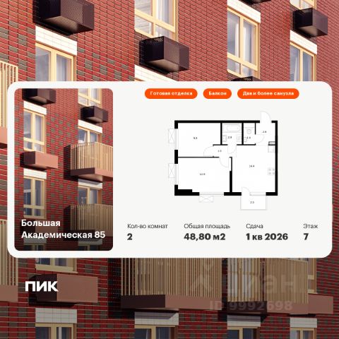 Продаётся 2-комн. апартаменты площадью 55,3 кв.м на 4 этаже 24 этажного дома (Корпус 3.6, Секция 2) проекта ПИК Большая Академическая 85. Светлый просторный подъезд на уровне земли, функциональная планировка, большие окна, c отделкой. "Большая Академическая 85" возводится в Тимирязевском районе — одном из самых тихих и зелёных мест в Москве. От домов до метро "Окружная" — 15 минут пешком, а до станции МЦК "Лихоборы" — 11 минут. Рядом с "Большой Академической 85" есть всё необходимое для комфортной жизни: поблизости работают семь детских садов, шесть школ, три вуза и два торговых центра. Вокруг много парков, в которых приятно гулять и отдыхать. В жилой квартал входят одиннадцать корпусов, в которых есть квартиры и апартаменты. Переменная высота домов — от 11 до 24 этажей — создаёт ощущение простора и позволяет солнечному свету свободно проникать во дворы и комнаты. Фасады природных цветов украшены разными фактурными элементами, поэтому каждый дом выглядит по-особенному. В домах просторные и светлые подъезды без ступеней и пандусов, с выходами во двор и на улицу. На первых этажах домов — магазины и кафе. Для владельцев автомобилей предусмотрен подземный паркинг, а для самых маленьких жителей — собственный детский сад, который объединён с начальной школой. В зелёных дворах-парках оборудованы современные детские площадки и места для отдыха. Ещё на территории проекта есть Local Play — большое игровое пространство для детей, где будет интересно и малышам, и подросткам. Артикул 924719 (Застройщик ООО "СПЕЦИАЛИЗИРОВАННЫЙ ЗАСТРОЙЩИК ЛИХОБОРЫ") Продам 2-комнатную квартиру в районе Тимирязевский в Москве.