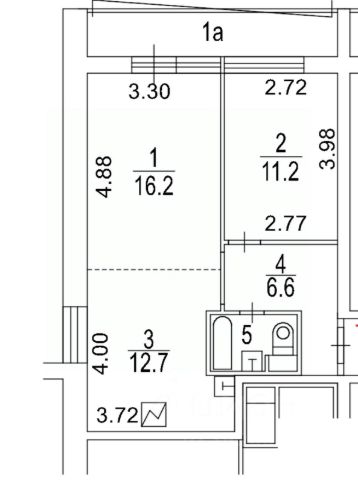 Общая площадь: 51.80 м.кв., Жилая площадь: 27.10 м.кв., Площадь кухни: 13.00 м.кв., Кухня-гостинная, Квартира переделана из 2-комнатной в 1-комнатную