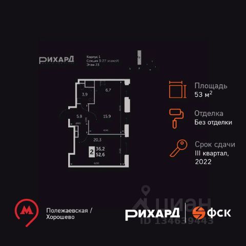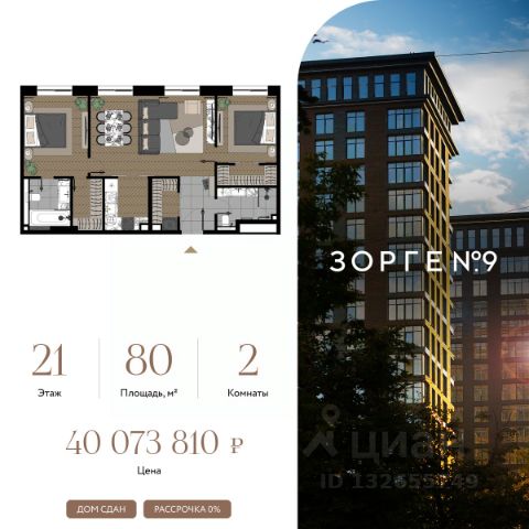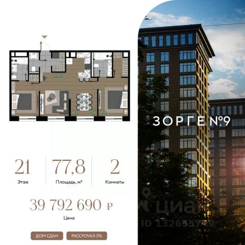 Апартаменты в готовом квартале бизнес-класса от компании St MICHAEL. Всего в комплекс входят 3 стильных высотных корпуса с модной архитектурой, собственным фитнесом и сервисами премиальных отелей. Отличная транспортная доступность и расположение в окружении крупных парковых зон характеризует комплекс как особенно привлекательный для жизни и инвестиционных вложений. На верхних уровнях комплекса расположены функциональные пространства с высотой потолка до 4,3 метров и панорамными окнами. В угловых апартаментах благодаря сплошному остеклению реализован эффект стеклянной стены. Элегантные лобби с дизайнерской отделкой премиальными материалами, lounge-зона для отдыха и встреч с гостями, кафе с камином и легким эмбиентом, стильная отделка холлов гармонично перекликается с фасадами в стиле архитектуры Нью-Йорка. "Зорге 9" — это элегантные лобби с дизайнерской отделкой премиальными материалами, высокие потолки, панорамные окна, благоустроенный просторный двор в одном из лучших районов для жизни в Москве. Роскошная инфраструктура комплекса: консьерж-сервис, подземный паркинг, цифровой лифт, вход по Face ID, свой фитнес-клуб с бассейном, парк с сухим фонтаном, магазины и рестораны. Представлен широкий выбор вариантов площадей от 27 до 81 кв. м, свободной планировки, с окнами в пол и высотой потолков до 4,3 м. Есть уникальные форматы пространств апартаменты с террасами, пентхаусы и хай-флеты. "Зорге 9" СДАН, все корпуса введены в эксплуатацию. Продается 2-комнатная квартира на улице Зорге в Москве.