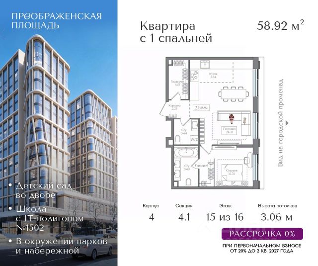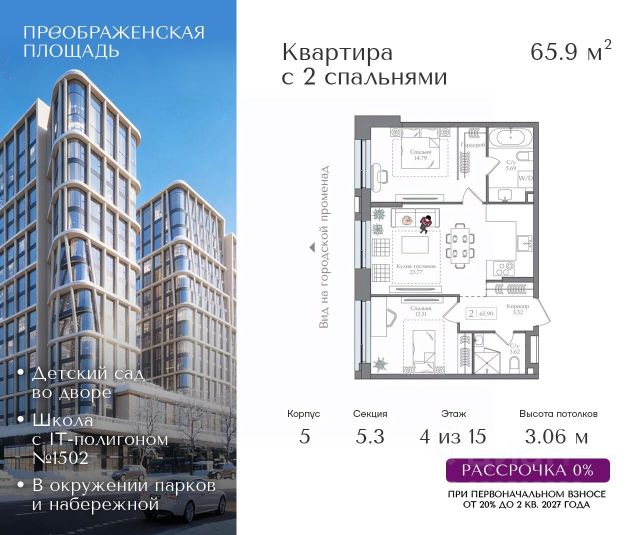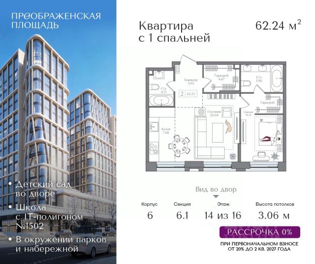 Рассрочка 0% от застройщика. Первоначальный взнос от 20%. Предложение действует до 31 января 2026 года Стоимость указана с учетом скидки 5%. Квартира на 9 этаже в жилом комплексе премиум-класса "Преображенская площадь". Общая площадь: 62.74 кв.м. Проект премиум-класса в историческом районе Москвы. До метро "Преображенская площадь" 3 минуты пешком. Квартиры сдаются без отделки и в свободной планировке, чтобы жители могли оформить пространство с учетом своей индивидуальности. Высота потолков от 3,15м, широкоформатное остекление, 3-5 квартир на этаже. Система Умный дом. Дизайнерские лобби. Внутренний двор 1,5 га функциональное и безопасное пространство для игр, работы и занятий спортом. Пешеходный променад для прогулок. Дома переменной этажности. Есть подземный паркинг. Жилой комлекс находится в окружении парков Сокольники, Черкизовский, Измайловский, заповедника Лосиный остров и ВДНХ, а также вблизи пешеходной набережной. Комфортная удаленность от центра: 7 минут на автомобиле до ТТК, 8 минут до Садового кольца, 25 минут до Кремля.