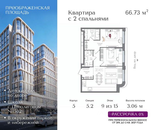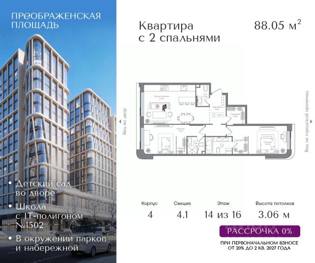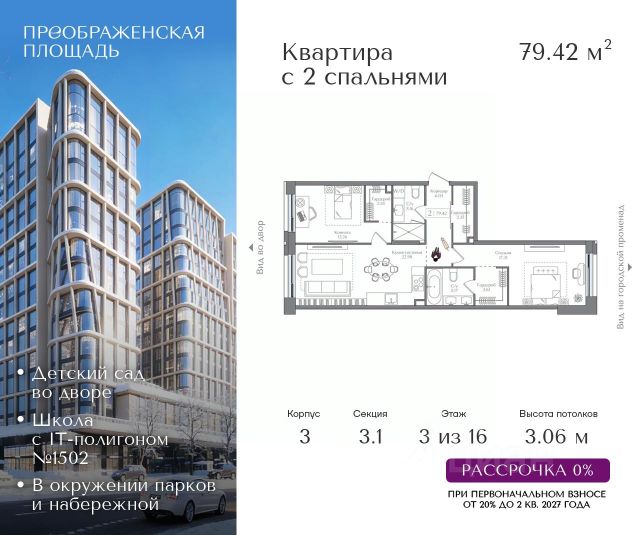 Рассрочка 0% от застройщика. Первоначальный взнос от 20%. Предложение действует до 31 января 2026 года Квартира на 5 этаже в жилом комплексе премиум-класса "Преображенская площадь". Общая площадь: 40.94 кв.м. Проект премиум-класса в историческом районе Москвы. До метро "Преображенская площадь" 3 минуты пешком. Квартиры сдаются без отделки и в свободной планировке, чтобы жители могли оформить пространство с учетом своей индивидуальности. Высота потолков от 3,15м, широкоформатное остекление, 3-5 квартир на этаже. Система Умный дом. Дизайнерские лобби. Внутренний двор 1,5 га функциональное и безопасное пространство для игр, работы и занятий спортом. Пешеходный променад для прогулок. Дома переменной этажности. Есть подземный паркинг. Жилой комлекс находится в окружении парков Сокольники, Черкизовский, Измайловский, заповедника Лосиный остров и ВДНХ, а также вблизи пешеходной набережной. Комфортная удаленность от центра: 7 минут на автомобиле до ТТК, 8 минут до Садового кольца, 25 минут до Кремля.