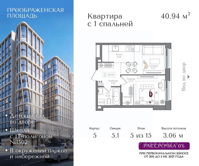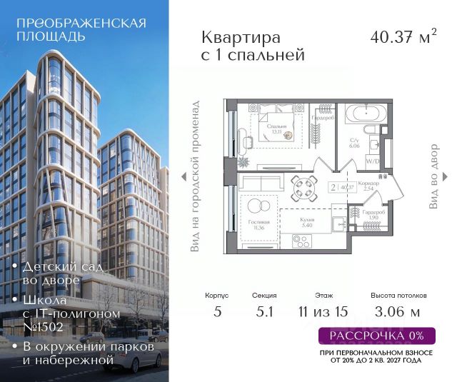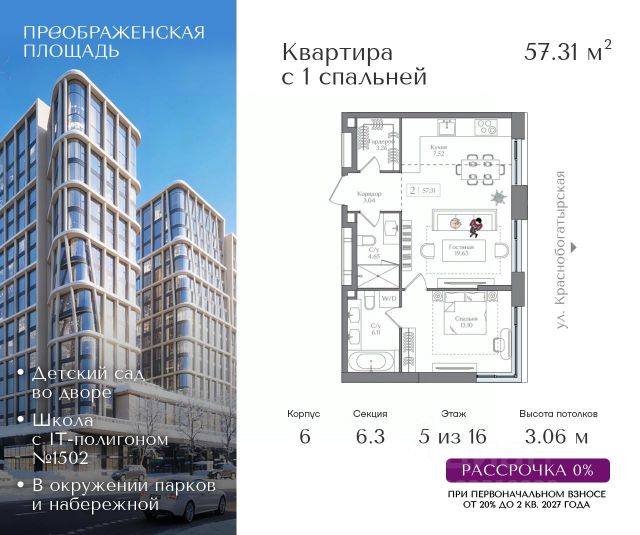 Рассрочка 0% от застройщика. Первоначальный взнос от 20%. Предложение действует до 31 января 2026 года Квартира на 5 этаже в жилом комплексе премиум-класса "Преображенская площадь". Общая площадь: 57.31 кв.м. Проект премиум-класса в историческом районе Москвы. До метро "Преображенская площадь" 3 минуты пешком. Квартиры сдаются без отделки и в свободной планировке, чтобы жители могли оформить пространство с учетом своей индивидуальности. Высота потолков от 3,15м, широкоформатное остекление, 3-5 квартир на этаже. Система Умный дом. Дизайнерские лобби. Внутренний двор 1,5 га функциональное и безопасное пространство для игр, работы и занятий спортом. Пешеходный променад для прогулок. Дома переменной этажности. Есть подземный паркинг. Жилой комлекс находится в окружении парков Сокольники, Черкизовский, Измайловский, заповедника Лосиный остров и ВДНХ, а также вблизи пешеходной набережной. Комфортная удаленность от центра: 7 минут на автомобиле до ТТК, 8 минут до Садового кольца, 25 минут до Кремля.