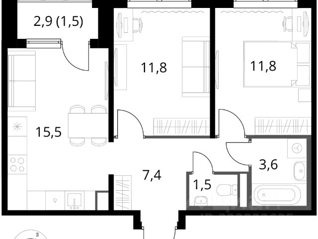 Удобная и практичная планировка - большая кухня (11,81м.кв.) и лоджия (4,5м.кв.), просторные комнаты (19,25м.кв. и 15,4м.кв.), с/у раздельный.