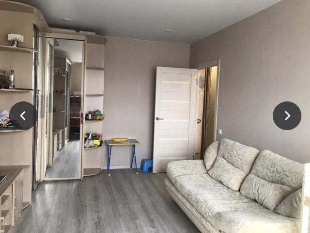 На кухне качественный гарнитур с вместительными шкафами, раскладной стол со стульями, в комнате двуспальная кровать, оборудованная гардеробная, в прихожей встроенный шкаф, вешалка для одежды. В комнатах на полу ламинат высокого класса уложен по диагонали, без порожков. В прихожей, ванной комнате и на кухне керамогранит. Установлена качественная сантехника, хорошая входная дверь.