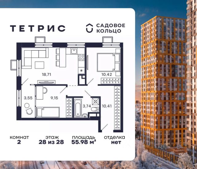 Продается квартира в ЖК Тетрис с 2 спальнями на 28 этаже 28 этажного дома. Общая площадь: 55.98 кв.м. Высота потолков 2.95 м. Срок сдачи 2 квартал 2026 г. Эскроу-счет. Застройщик ГК "Садовое кольцо". Семейный жилой комплекс "Тетрис" с собственной развитой инфраструктурой, благоустроенным двором и функциональными планировочными решениями. Собственный двор-парк, детские и спортивные площадки. Продуманные зоны отдыха с ландшафтным дизайном. Охраняемая дворовая территория и круглосуточное видеонаблюдение. Рядом удобная транспортная развязка и станция МЦД Павшино. ЖК "Тетрис" объединяет все важнейшие факторы, формирующие комфорт: Просторный обустроенный двор — место, где весело проводить время с друзьями и семьей. Свой торговый центр, чтобы любая мелочь была под рукой. Удобная локация и транспортная доступность. Свои медицинский центр и школа с блоком начальных классов. Жилой комплекс "Тетрис" обеспечит вам идеальное пространство для жизни, где все необходимое под рукой. Благодаря этому вы получаете самый драгоценный ресурс - время на общение с друзьями и семьей, заботу о себе и личное развитие.