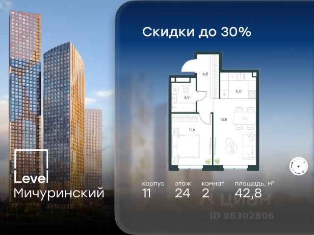 Цена указана с учётом скидки при 100%-й оплате, несубсидированной ипотеке, рассрочке (кроме программы "Рассрочка 0%"). В жилом квартале, расположенном на границе с природным заказником "Долина реки Очаковки", продаётся 2-комнатная квартира площадью 44.00 кв.м без отделки. Квартира расположена на 12 этаже 12-этажного корпуса 9 в жилом комплексе бизнес-класса Level Мичуринский (компания Level Group/Левел групп). Отличная транспортная доступность - 10 мин. пешком до станции метро "Мичуринский проспект" - 15 мин. пешком до станции метро "Аминьевская" - 7 мин. на авто до МКАД - 10 мин. на авто до ТТК - 15 мин. на авто до Москва-Сити Продуманный архитектурный проект - Выразительная архитектура от известных бюро: корпуса 1-6 - СПИЧ, корпуса 7-13 - Borisov Architects; - Из окон открываются живописные виды на парки, Москва-Сити и МГУ; - Высокие потолки до 6,35 м; - Стильные лобби с окнами в пол и высокими потолками до 4,7 м; - С каждого этажа дома на лифте можно спуститься в подземный отапливаемый паркинг. Расположение Level Мичуринский строится в одном из самых зеленых районов Москвы - Очаково-Матвеевское. Этот уголок столицы идеален для поддержания здорового образа жизни. В шаговой доступности от проекта находятся заказник "Долина реки Очаковки" - 1 мин. пешком и Очаковский парк - 7 мин. пешком. На велосипеде можно добраться до таких парков, как "Событие", парк Олимпийской деревни, парк 50-летия Октября и парк Школьников. В 15-минутной доступности на авто расположено более 30 детских садов (из них 14 в пешей доступности), 32 школы (из них 13 в пешей доступности) и 14 вузов. В ближайшем окружении работает более 25 медицинских учреждений, 11 спортивных клубов и 22 продуктовых супермаркета. Внутренняя инфраструктура На территории жилого комплекса строится три детских сада и школа. На первых этажах домов откроется супермаркет, фитнес-центр, ресторан, кафе и другие сервисы. Подземные этажи займут паркинги: трехуровневые в этапах 1 и 2, одноуровневый в этапах 3 и 4. Преимущества проекта - 4,5 га благоустроенной территории с видовым мостом, уличным кинотеатром, зонами для тихого отдыха, работы, воркаута, площадки для петанка, футбола, настольного тенниса и пляжного волейбола; - Дизайнерские лобби с панорамным видом на двор, мойками для лап животных и комфортными зонами ожидания. - Безопасность жителей: круглосуточное видеонаблюдение всех зон общего пользования (лобби, лифты, паркинги, детские площадки), система контроля доступа, управление видеодомофоном через мобильное приложение, единый ключ доступа на территорию жилого комплекса. - Технологии и комфорт: высокоскоростной Wi-Fi в лобби и на придомовой территории, автоматическая система контроля и учета ресурсов, абонентская связь с консьержем, распознавание номеров автомобилей при въезде/выезде в/из паркинга.