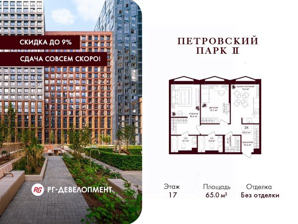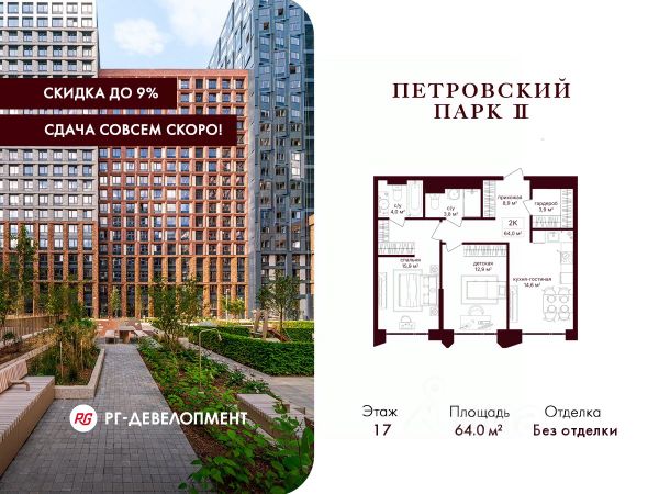 Продаётся 2-комнатная квартира 65,0 кв.м. в ЖК "Петровский парк II" на 17-м этаже 17 этажного дома. Скидка 9% при покупке квартиры! Цена указана с учетом максимального размера скидки. Компания "РГ-Девелопмент" предоставляет скидки на квартиры в жилом комплексе. Акция действительна с 01.10.2025 до 31.10.2025 включительно. Для того чтобы воспользоваться предложением, необходимо подписать договор на приобретение недвижимости до 30.09.25г., включительно. ЖК "Петровский парк II" расположен в историческом районе Москвы, в 5 минутах от парка и станции метро "Динамо". Архитектуру от Syntaxis характеризуют асимметричные фасады, геометрические выступы, напоминающие волны. Эстетика архитектурных форм продолжается в интерьере внутренних пространств - двух центральных лобби и входных группах. На закрытой территории зеленые зоны с цветниками, места для отдыха, спортивные и игровые площадки. Подземная парковка, близость основных магистралей и удобные выезды, которые дают возможность жителям комплекса быть в центре культурной и общественной жизни. Комфортной жизни на территории комплекса расположены магазины, рестораны, частный детский сад.