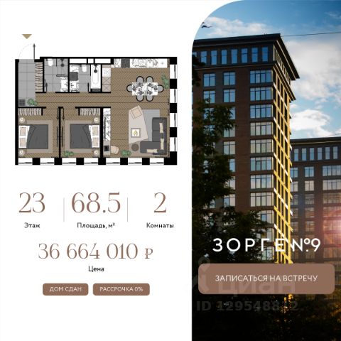 "Зорге 9" — готовые апартаменты бизнес-класса на Ходынке. 10 минут до Москва-Сити. Архитектура: 3 современных корпуса с фасадами в стиле архитектуры Нью-Йорка и с сервисами премиальных отелей, высотой до 23 этажа. Строгие линии, панорамные окна создают ощущение неподдельной роскоши и комфортной жизни в сердце мегаполиса. Проект награжден авторитетной премией European Property Awards. Резиденции: Свободная планировка, небольшая глубина этажа, огромные панорамные окна в пол до 3,6 м и высота потолков до от 3,3 до 4,3 м позволяют реализовать самые смелые концептуальные идеи и создать идеальный интерьер с учетом всех пожеланий. Вдохновляющие виды на город украсят ваш апартамент лучше любой картины. Есть возможность приобретения дизайн-проекта и полной меблировки апартаментов от партнеров девелопера. Расположение: 3 мин. пешком до парка Березовая роща 10 мин. пешком до Ходынского поля 10 мин. до ТЦ Авиапарк 30 минут до Шереметьево 10 мин до Москва-Сити или 1 станция до Москва-Сити 5 минут до ТТК 4 станции метро в шаговой доступности: 6 мин м. Полежаевская (фиолетовая ветка) 7 мин МЦК Зорге (МЦК) 7 мин м. Хорошевская (голубая ветка) 10 мин МЦК Хорошёво (МЦК) Благоустройство: Собственный парк 2 га с амфитеатром и поющими фонтанами. В парке высажено 136 деревьев и более 11 000 кустов и мелких растений из немецких питомников. Площадка для йоги и воркаут-зона со спортивными площадками. Теннисные столы и детский плейхаб Две башни Авторское гранд-лобби В лобби предусмотрена лаундж-зона, чайная с камином, комната для хранения велосипедов и колясок. Доступ по системе FACE ID. В отделке лобби и лифтовых холлов использован декоративный камень итальянского бренда Atlas Concorde Пентхаусы На верхнем уровне комплекса расположены роскошные просторные пентхаусы с высотой потолка до 4,2 метра и панорамными окнами до 3,6 метров, открывающими великолепные виды на столицу. Пентхаусы с выходами на собственные приватные террасы на кровле, площадью от 150 кв. м являются жильем high-уровня, демонстрирующим высокий статус владельца.