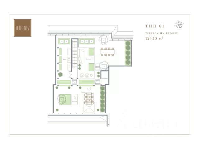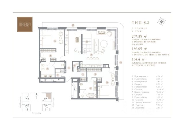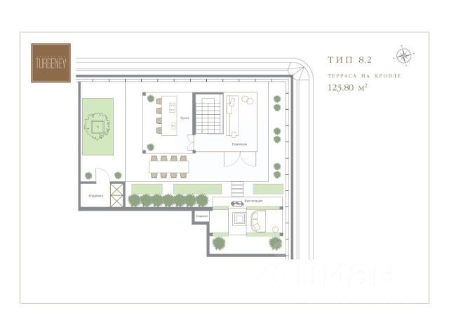 Пентхаус с 2 спальнями (134,4 м2) и премиальной финишной отделкой располагается на 8 этаже Клубного дома TURGENEV и обладает выходом на собственную террасу на кровле (123,80 м2). По всей длине внешнего периметра пентхауса - вдоль двух спален и просторной кухни-столовой-гостиной (58,03 м2) с дровяным камином и зоной кабинета, протянулась открытая галерея (7,50 м2) с видом на северо-западную часть Москвы. Панорамные окна мастер-спальни (16,70 м2) выходят на северную сторону - тихий Селиверстов переулок, а окна второй спальни (18,70 м2) на западную. При мастер-спальне располагается ванная комната с двумя раковинами (9,72 м2), при второй спальне - душевая комната (8,30 м2). У каждой спальни есть собственная гардеробная (5,02 м2 и 6,10 м2). В квартире также есть гостевой санузел (1,64 м2) и постирочная. Дом сдан. Клубный дом TURGENEV (Тургенев) расположен в ЦАО Москвы в районе Чистых прудов, в тихом месте на Костянском переулке между Садовым и Бульварным кольцом, в 3 км от Красной площади Кремля. Рядом большое количество достопримечательностей, музеев, театров, ресторанов, баров, торговых центров. Архитектурный проект дома разработан при участии международной команды архитекторов: Squire&Partners из Британии и Building Design Architectuur из Нидерландов. Фасад - натуральный камень: первые 6 этажей - португальский известняк, 7 и 8 этажи - гранит Dark Brown. Клубный дом TURGENEV имеет П-образную форму и состоит из 8 этажей, 5 секций и 118 квартир, включая двухуровневые пентхаусы с террасами и каминами. Все квартиры в Клубном доме TURGENEV реализуются с чистовой премиальной дизайнерской отделкой в современном стиле контемпорари от нидерландского бюро Wolterinck. В отделке квартир в TURGENEV используются экологичные, природные материалы премиального качества: пол из натуральной австрийской паркетной доски Austriawood, стены - итальянская краска PRATTA Exclusive, в санузлах - английская штукатурка Tadelakt и натуральный мрамор: итальянский Wooden White и греческий Pirgon. В каждой квартире установлены кухни от итальянского бренда Cesar со встроенной бытовой техникой премиальной линейки Smeg. Кухонный остров, столешница и фартук кухни выполнены из эксклюзивного итальянского мрамора Arabescato Grigio Orobico, одним из лучших видов мрамора на итальянском рынке натуральных отделочных камней. Внутренний двор с садом Клубного дома TURGENEV - оазис с зелеными газонами, мощеными тропинками, фонтанами, водными каналами и зонами для отдыха. Сад идеально вписан в пространство внутреннего двора. В доме предусмотрен инфраструктурный этаж, на котором расположены бассейн, фитнес-зона, зал для йоги, сауна, хаммам, дорожка Кнейпа, массажные кабинеты, кинотеатр, ресторан, винная, сигарная и переговорная комнаты. Вся инфраструктура Клубного дома TURGENEV также выдержана в едином стиле проекта. Каждый покупатель квартиры в Клубном доме TURGENEV может заказать дополнительную опцию - меблировка "под ключ". Лоты в новостройке можно оборудовать дизайнерской мебелью итальян