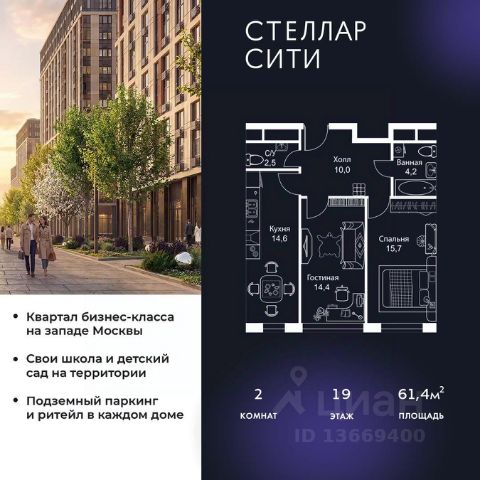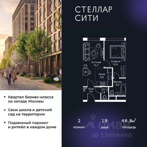 Продается квартира от надежного застройщика Tashir Estate в квартале бизнес-класса Stellar City в ЗАО Москвы. Площадь квартиры составляет: 46.3 кв. м, потолки: 3.1 м Квартира находится на 19 этаже, 4 корпуса жилого квартала Stellar City — микрогорода будущего на орбите Москвы. Stellar City — квартал в ЗАО Москвы вблизи инновационного центра Сколково. В окружении — 11 парков и природных зон, в том числе Долина реки Сетунь, Мещерский лес и парк развлечений The Rink. Город в городе Чтобы дом и инфраструктура вокруг отвечала динамичному лайфстайлу жителя мегаполиса, в основу проекта легла концепция город в городе, которая позволяет решать все бытовые вопросы in-home. В квартале будут возведены школа и детский сад, воркаут-зоны, променад, вело и беговые дорожки, детские площадки для каждого корпуса, а также коммерция на первых этажах для ежедневных покупок. Все необходимое — на расстоянии нескольких шагов. Изящные и лаконичные лобби Авторский дизайн, натуральные материалы в отделке и безупречный интерьер вне времени. Лобби и холлы в проекте бизнес-класса Stellar City ничем не отличаются от входных групп в премиум-сегменте благодаря качественным европейским материалам в отделке, стильному дизайну, консьерж-сервису и уютной зоне ожидания с журнальными столиками и мягкой мебелью. Комфорт и безопасность Закрытая территория, охрана, система СКУД, специально разработанное мобильное приложение дома для резидентов и подземный паркинг с круглосуточным наблюдением и доступом с помощью автоматического считывания номера авто.