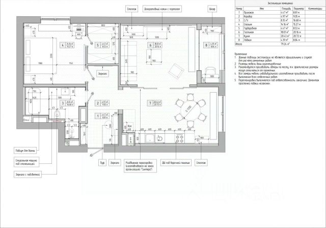 Много мест для хранения: два шкафа купе и мини-гардеробная, все с двумя уровнями вешалок, длиною суммарно 7м и полки, суммарно, 6мкв.