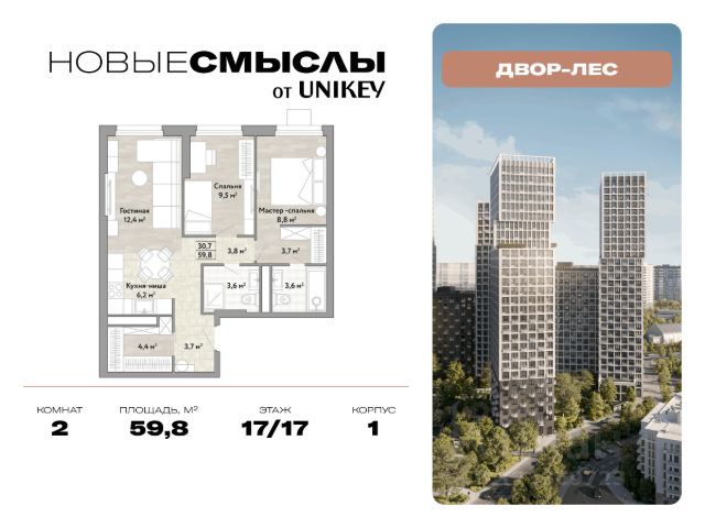 В жилом комплексе, расположенном по соседству с ландшафтным парком "Южное Бутово", продается 2-комнатная квартира площадью 63.50 кв. м. с отделкой. Квартира расположена на 17 этаже 1 корпуса в жилом квартале комфорт-класса "Новые Смыслы" (ГК Unikey/Юникей). Доступная и удобная локация: - 10 минут ходьбы до станции метро "Потапово". - 25 минут ходьбы до станции метро "Бунинская аллея". - 15 минут на авто до Калужского шоссе. - 20 минут на авто до МКАД. - 30 минут на машине до аэропортов "Внуково" и "Остафьево". Продуманный архитектурный проект: - Разноуровневые секции с эстетичные башнями и контрастными цветовыми сочетаниями, напоминающими башни в Сити. - Сказочные виды из окон на современный район столицы. - Авторские планировки с потолками в 3 метра, просторными кухнями-гостиными и мастер-спальнями. - Комфортные бесплатные общественные пространства. - Подземный паркинг с прямым доступом на лифте. - Настоящий лес с живописными пейзажами и прудом прямо во дворе. Расположение Комплекс "Новые Смыслы" расположится в благоприятном районе Новой Москвы - Коммунарка. Зеленое окружение, богатая инфраструктура развивающегося района - все это сформирует особое пространство для комфортной жизни, наполненной смыслом. 10 минут на велосипеде - и вы в ландшафтном парке "Южное Бутово" или сквере у Потаповских прудов. Чуть дальше расположен Бутовский лесопарк. В окружении "Новых Смыслов" вы найдете все необходимые социальные объекты. В двух шагах от дома находится 5 школ, более десятка детских садов, секции для занятий малышей и подростков, частные клиники, супермаркеты, рестораны, студии красоты и фитнес-центры. За 12 минут на авто вы доберетесь до ледовой арены, комплекса "Спорт Станция" и спа-центра "Termoland". Внутренняя инфраструктура Для жителей "Новых Смыслов" будут созданы бесплатные общественные пространства: - Деловая гостиная с эстетичным коворкингом и переговорными. - Гостиная для души и тела, включающая фитнес-зону с тренажерами и пространства для стретчинга, йоги и медитаций. - Гостиная детства, где дети будут играть и развиваться под присмотром тьютора. - Кино-гостиная - кинотеатр на крыше одного из домов, предлагающий разнообразную программу. - Прачечная, работающая только для жильцов. Вместе с корпусами комплекса на территории запланировано строительство детского сада. На первых этажах корпусов откроются кофейни, пекарни, сервисы быта и пункты доставки. Благоустройство Чтобы отдохнуть от суеты города, достаточно выйти во двор: здесь раскинулся настоящий лес с живописными пейзажами. В тени деревьев жителей ждут пруд с мостиком и беседкой на берегу, тихие прогулочные аллеи, спортивная площадка и зоны для занятий йогой и бадминтоном на свежем воздухе. Юных жителей порадуют современные детские площадки, жукарий и специальное пространство для подвижных игр. Безопасность на территории гарантирована: двор огорожен от машин и оснащен камерами видеонаблюдения.