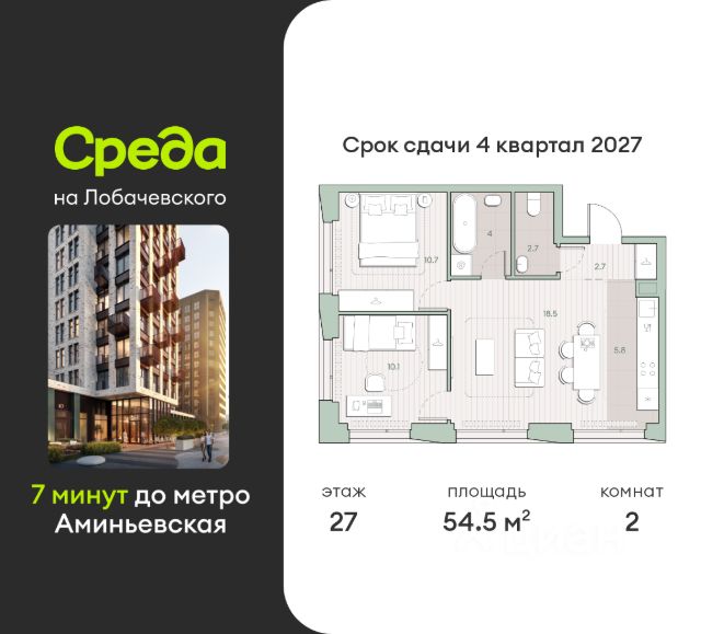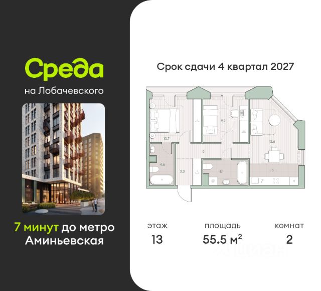 О квартире Продаётся 2-комнатная квартира общей площадью 65.2 кв.м. без отделки. Квартира расположена на 13 этаже корпуса 5.7 в жилом комплексе бизнес-класса "Среда на Лобачевского" в пешей доступности от метро "Аминьевская". О жилом комплексе "Среда на Лобачевского" полностью соответствует критериям современного жилого пространства. Взяв за основу рациональный подход, мы гармонично соединили дизайн, актуальные тренды и функциональность. Продуманный современный экстерьер и функциональные планировки внутри, приватные пространства и разнообразные досуговые зоны для каждого члена семьи — все это "Среда на Лобачевского". Инфраструктура Район отлично развит и наполнен жизнью, здесь уже есть вся необходимая инфраструктура — детские сады, школы, медучреждения, торговые центры, благоустроены парки для прогулок и отдыха, удобен и легкодоступен городской транспорт. Рядом расположены учебные корпуса крупных университетов — МГУ, МГИМО и РАНХиГС. Школы и детские сады в районе занимают высокие позиции в городских рейтингах, поэтому вам не придется беспокоиться о качестве образования детей. Как и об отдыхе: поблизости расположены живописные пруды, реки и парки. Это Парк Олимпийской деревни, Парк имени 50-летия Октября, Мещерский парк и Очаковские пруды. Теперь поставить галочки в еженедельном чек-листе "спорт-прогулки-встречи с друзьями" можно, не покидая любимый район. Особенности Особое внимание в проекте уделяется созданию функциональных пространств не только внутри дома, но и за его пределами. В ландшафтном парке "Среды на Лобачевского" расположены крытые зоны для спокойного времяпровождения, места для активного отдыха и спорта, коворкинг, соседский комьюнити-центр, водные объекты. —Ландшафтный парк во дворе. —Водный сад с зонами отдыха. —Зоны коворкинга. —Дизайнерские гранд-лобби. —Бесключевой доступ. —Подземный паркинг.