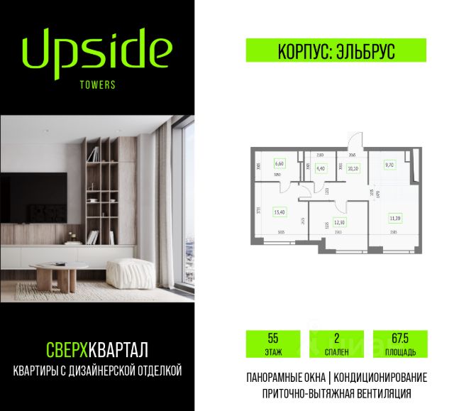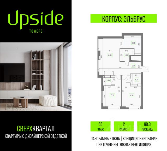 Продаётся 2-комнатная квартира площадью 88.8 кв.м на 55 этаже 55 этажного корпуса Эльбрус в квартале небоскребов "Upside Towers". c видом на прогулочный бульвар, 2 очередь, центр, Москва Сити, Савеловский Сити. Номер квартиры А5501. Upside Towers - технологичный квартал строится в динамично развивающемся Бутырском районе, в 3 мин. от метро, в 5 мин. от ТТК. На территории 7 га возводится 5 высотных башен от 19 до 58 этажей, названных в честь главных вершин земли. Квартиры с панорамными окнами в пол, высокими потолками и современными инженерными решениями. Благоустроенная зеленая территория включает: приватные дворы, природный комплекс, прогулочный бульвар, ландшафтный парк 2,5 га с сенсорным садом и многофункциональными игровыми и спортивными площадками. Большое внимание в проекте уделяется созданию социальной инфраструктуры. Более 2000 кв.м. отдано под Upside club закрытый клуб, уникальное пространство для общения и развития жителей квартала, включая SKY SPA Relax на 47 этаже башни "Атлас" расслабляющей атмосферой, джакузи, сауной, залами для релаксации и йоги доступное жителям Upside Towers, всесезонное барбекю-патио, лаундж зону с камином и роялем, многофункциональные игровые пространства, домашний кинотеатр, коворкинг и переговорные. В башнях откроются смотровые террасы для резидентов с панорамными видами на город, парки, Останкинскую башню, ВДНХ, Ботанический сад и Москву-Сити. В рамках проекта строится государственная школа и детский сад, разместится более 15 000 кв.м. коммерческой инфраструктуры. Насыщенная социальная инфраструктура формирует множество сценариев для жизни на территории квартала. В Upside Towers применяются лучшие технологии и практики, чтобы обеспечить высшее качество жизни: Воздух, не уступающий по качеству горному, обеспечит приточно-вытяжная вентиляция. Пятиступенчатая очистка воды с сохранением полезных минералов. Центральное кондиционирование. Внутрипольные конвекторы с естественной конвекцией. Современные системы безопасности и мониторинга микроклимата. Высокоскоростной интернет на всей территории, в квартирах и паркинге за счет усиления GSM-связи всех ведущих операторов. Все места в подземном паркинге оборудованы зарядками для электрокаров. Бутырский район непрерывно развивается и готовится стать новым современным деловым районом Москвы. В рамках программы "Индустриальные кварталы" комплексного развития территории Огородного проезда будут построены современные образовательные и спортивные учреждения, торговые центры, кафе, банки, общественно-деловые здания и другие объекты. В пешей доступности работают школы, детские сады, поликлиники, аптеки, супермаркеты и многое другое. Рядом находится несколько крупных зелёных зон для спокойного отдыха: Парк Останкино, ВДНХ, Парк Сокольники, Гончаровский парк, в 15 минутах пешком располагаются знаменитые арт-пространства - дизайн-завод Flacon и "Хлебозавод". Время в пути на автомобиле до центра Москвы 15 минут. (Застройщик ООО "СЗ "К-Девелопмент")