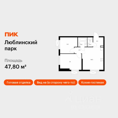 Проектная площадь с учетом лоджии составляет 66.18 м², жилая: комната 1-16,85 м², комната 2-15,98 м², лоджия- 3,90 м².