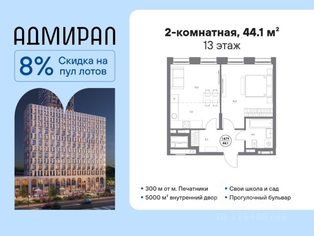В динамично развивающемся районе Москвы, всего в 300 метрах от метро и в пешей близости от нового городского порта с протяженной набережной 13 км, свободной от автомобилей, продается 2-комнатная квартира площадью 51.30 м². без отделки. Квартира находится в корпусе жилого комплекса бизнес-класса "Адмирал", расположенного по адресу г. Москва, ул. Шоссейная, 4Д. (Застройщик - "Галс Девелопмент"). Новый амбициозный проект "Адмирал" станет частью одного из самых перспективных районов будущего - "Сити-2". В пешей доступности от современных башен Вас ждут живописные Люблинские пруды, 2 усадьбы с уникальной историей и уютный парк "Печатники" у Перервинского плёса. Район имеет отличную транспортную доступность: • 300 метров до станции метро "Печатники"; • Удобная пересадка на БКЛ и станцию МЦД-2; • 10 минут на машине до ТТК; • 15 минут до Садового кольца. Архитектура корпусов отличается динамичностью облика благодаря переменной этажности: высокие башни сочетаются с домами средней этажности. Изящным украшением становятся арочные витражи. Интеллигентный и современный стиль "Адмирала" продолжается в гранд-лобби: пастельные оттенки интерьера и фактурные элементы декора создают атмосферу безмятежного отдыха, особое ощущение простора дарят высокие потолки до 4 м и витражные окна. В домах предусмотрено от трех до шести скоростных лифтов, каждый из них спускается на любой этаж подземного паркинга и обладает удобными сенсорными панелями управления и низким уровнем шума. Благоустроенный двор площадью 5000 кв.м. украсят десятки видов гипоаллергенных растений. Здесь можно совершить приятный променад, по пути заглядывая за свежезаваренным кофе, уединиться за ноутбуком в комфортном коворкинге, занять ребенка играми в двухъярусном плейхабе или помедитировать на специальной площадке для йоги. Мягкий свет декоративных фонарей подчеркнет живописность местности, а чувство безопасности гарантируют круглосуточные системы видеонаблюдения. Дополнительные преимущества: • Высокие потолки от 2,9 до 3,25 м; • Бизнес-центр, школа и детский сад прямо на территории дома; • Подземный двухуровневый паркинг на 1955 машино-мест; • Кладовые помещения в тёплом контуре на 2м этаже; • Стрит-ритейл на первых этажах.