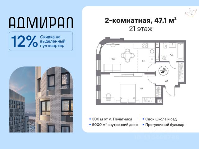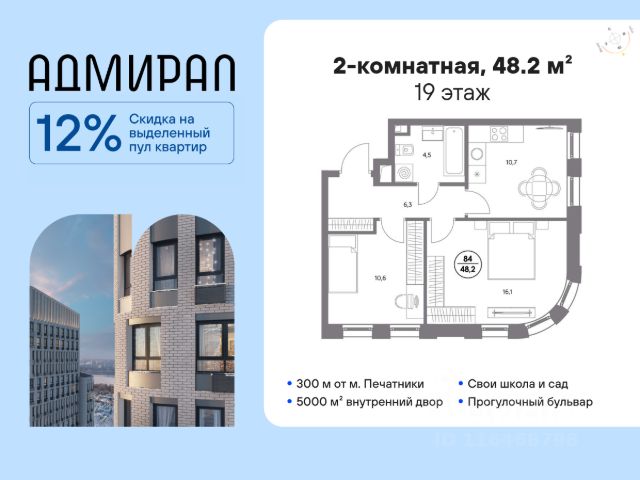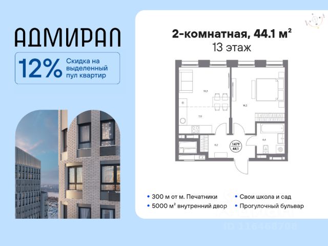 В динамично развивающемся районе Москвы, всего в 300 метрах от метро и в пешей близости от нового городского порта с протяженной набережной 13 км, свободной от автомобилей, продается 2-комнатная квартира площадью 44.10 м². без отделки. Квартира находится в корпусе жилого комплекса бизнес-класса "Адмирал", расположенного по адресу г. Москва, ул. Шоссейная, 4Д. (Застройщик - "Галс Девелопмент"). Новый амбициозный проект "Адмирал" станет частью одного из самых перспективных районов будущего - "Сити-2". В пешей доступности от современных башен Вас ждут живописные Люблинские пруды, 2 усадьбы с уникальной историей и уютный парк "Печатники" у Перервинского плёса. Район имеет отличную транспортную доступность: • 300 метров до станции метро "Печатники"; • Удобная пересадка на БКЛ и станцию МЦД-2; • 10 минут на машине до ТТК; • 15 минут до Садового кольца. Архитектура корпусов отличается динамичностью облика благодаря переменной этажности: высокие башни сочетаются с домами средней этажности. Изящным украшением становятся арочные витражи. Интеллигентный и современный стиль "Адмирала" продолжается в гранд-лобби: пастельные оттенки интерьера и фактурные элементы декора создают атмосферу безмятежного отдыха, особое ощущение простора дарят высокие потолки до 4 м и витражные окна. В домах предусмотрено от трех до шести скоростных лифтов, каждый из них спускается на любой этаж подземного паркинга и обладает удобными сенсорными панелями управления и низким уровнем шума. Благоустроенный двор площадью 5000 кв.м. украсят десятки видов гипоаллергенных растений. Здесь можно совершить приятный променад, по пути заглядывая за свежезаваренным кофе, уединиться за ноутбуком в комфортном коворкинге, занять ребенка играми в двухъярусном плейхабе или помедитировать на специальной площадке для йоги. Мягкий свет декоративных фонарей подчеркнет живописность местности, а чувство безопасности гарантируют круглосуточные системы видеонаблюдения. Дополнительные преимущества: • Высокие потолки от 2,9 до 3,25 м; • Бизнес-центр, школа и детский сад прямо на территории дома; • Подземный двухуровневый паркинг на 1955 машино-мест; • Кладовые помещения в тёплом контуре на 2м этаже; • Стрит-ритейл на первых этажах.