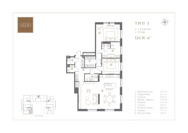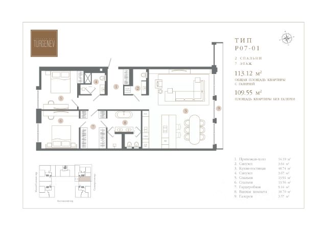 Пентхаус с 2 спальнями (134,4 м2) и премиальной финишной отделкой располагается на 8 этаже Клубного дома TURGENEV и обладает выходом на собственную террасу на кровле (123,80 м2). По всей длине внешнего периметра пентхауса - вдоль двух спален и просторной кухни-столовой-гостиной (58,03 м2) с дровяным камином и зоной кабинета, протянулась открытая галерея (7,50 м2) с видом на северо-западную часть Москвы. Панорамные окна мастер-спальни (16,70 м2) выходят на северную сторону - тихий Селиверстов переулок, а окна второй спальни (18,70 м2) на западную. При мастер-спальне располагается ванная комната с двумя раковинами (9,72 м2), при второй спальне - душевая комната (8,30 м2). У каждой спальни есть собственная гардеробная (5,02 м2 и 6,10 м2). В квартире также есть гостевой санузел (1,64 м2) и постирочная. Дом сдан.