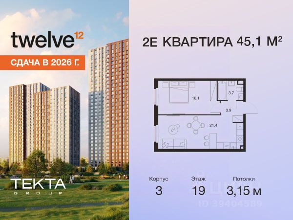 Рассрочка 0% с платежом от 120 000 ₽ в месяц. Сдача уже в 2026 году 2-комн. квартира в ЖК "Твелв" на 10 этаже в 34 этажном здании Корпус 1. Общая площадь: 43.6 кв.м., жилая: 27.90 кв.м. Высота потолков 3.00 м. ЖК Твелв от застройщика Текта Групп — это новый уровень жизни в районе Нагорный в 3-х минутах от станции метро. Проект представляет собой воплощение современной концепции комфортной жизни, где функциональность органично сочетается с эстетикой. Архитектура Твелв создает атмосферу, вдохновляющую на успех и располагающую к позитивным эмоциям. Дом, в котором каждый день будет наполнен уютом, а не рутинной работой и дорожными пробками. Твелв предлагает своим жильцам продуманные планировки, возможность объединения квартир, а также увидеть красоту города через угловое остекление увеличенных окон. Особое внимание уделено комфорту жителей: благоустроенная территория, зеленые насаждения, детские площадки, парковка. ЖК Твелв — это больше, чем просто жилье: это атмосфера умиротворенности, комфорта и гармонии.