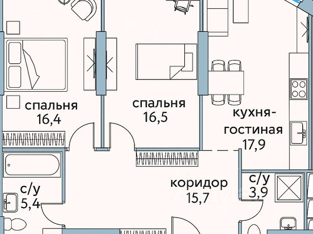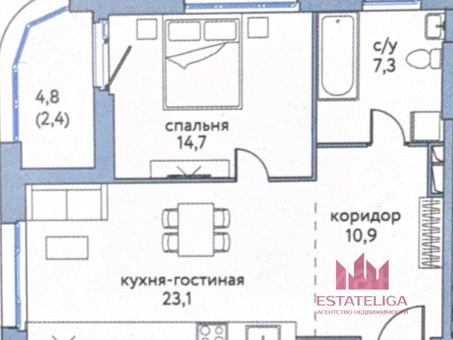 Общая площадь составляет 60.50 кв. м, спальня с выходом на лоджию - 14.70 кв. м, кухня-гостиная - 23.1 кв. м., совмещенный санузел, просторный коридор.