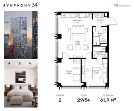 Дом сдан. Ключи в день покупки! В продаже 2-комнатная квартира площадью 63.20 м² с предчистовой отделкой на 27 этаже 54 этажного дома в корпусе Графит. ЖК Симфония 34 - концептуально новый жилой комплекс премиум-класса с подземной парковкой, состоит из четырех башен высотой 36 - 54 этажа. Квартиры сдаются с базовой (предчистовой) отделкой MR BASE или дизайнерской чистовой отделкой MR READY. Высота потолков 3 - 6 метров, окна высотой до 2,6 м. Более 100 кладовых в подземной части ЖК и более 500 на этажах. Безопасность - Система контроля входа на территорию комплекса, биометрия - Система автоматического водяного пожаротушения и противопожарного водопровода, система пожарной вентиляции - Доступ на парковку при помощи системы распознавания автомобильных номеров, карточка для контроля доступа резидентов - Система видеонаблюдения - Круглосуточная связь через приложение, телефон, голосовые сообщения с охраной, консьержем, call-центр. Расположение Пешком - 6 минут до метро "Дмитровская" - 15 минут до Тимирязевского парка На машине - 5 минут до Савеловского вокзала и Аэроэкспресса в Шереметьево - 10 минут до Москва-Сити и Садового кольца Благоустройство - 70% территории отведены под зеленые насаждения и ландшафтный дизайн - Приватный Японский сад - Детские площадки с зонированием по возрасту - Clubhouse для резидентов - Wellness & SPA - Зона для пикника, зона с гамаками - Центральное лобби, ресторан, коммерческие помещения - Дополнительный вход/выход на территорию комплекса Окружение - В 10 минутах от Symphony 34 находится дизайн-завод Flacon, где регулярно проходят культурно-образовательные и развлекательные мероприятия - Тимирязевский парк расположен в 850 м. Площадь парка 232 га - Рядом расположен парк "Дубки", площадью 16,5 га. - В 15 минутах расположен Хлебозавод 9. Здесь находятся шоурумы брендов, кафе разных кухонь мира, образовательные проекты и площадки для мероприятиКомпания MR предлагает своим клиентам специальные условия приобретения квартир в рамках программ ипотечного кредитования от банков-партнеров. Купить 2-комнатную квартиру в готовой новостройке в округе САО в Москве.