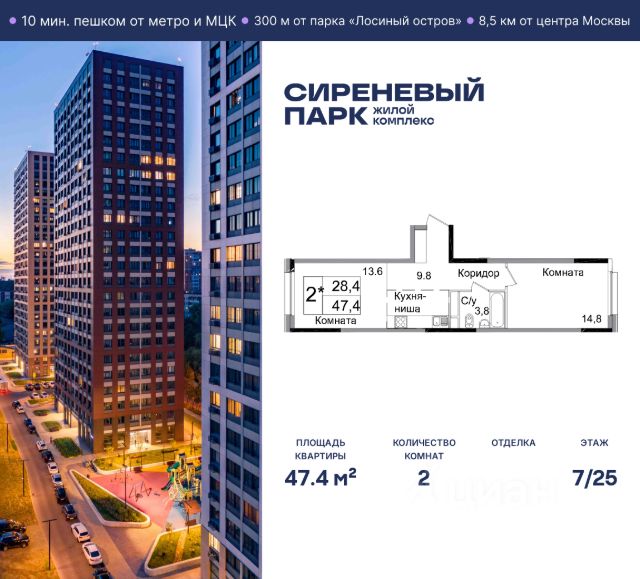 Продаётся просторная 2-комнатная квартира общей площадью 55 м² на 21 этаже в новом жилом комплексе "Сиреневый парк", расположенном в Восточном административном округе Москвы на улице Тагильская. Всего 10 минут ходьбы от станции метро "Бульвар Рокоссовского" и одноимённой платформы МЦК. Высококачественное монолитное строительство гарантирует сохранение тепла в доме, а наличие квартир с предчистовой и чистовой отделкой позволяет вам сэкономить время и сразу же переехать в свое жилье после покупки. Благодаря разнообразию планировок вы сможете выбрать идеальный вариант, соответствующий вашим предпочтениям и образу жизни. Предлагаются квартиры: - с просторными кухнями-гостиными, - с нишами для хранения вещей и отдельными гардеробными, - мастер-спальни с собственными санузлами, - большие комнаты с высокими потолками (2,9 м) и с увеличенными безопасными окнами (1,95 м) , которые наполнят ваш дом естественным светом; - с чистовой отделкой по двум дизайн-проектам на выбор; - с остекленными лоджиями и панорамными видами на лес. Каждая деталь в этом доме создана для вашего комфорта: - безбарьерная среда, - бесшумные скоростные лифты, - машиноместа в отапливаемом подземном паркинге и кладовые на -1 этаже с доступом из лифта, - развитая инфраструктура с супермаркетами, кафе, фитнес-клубами, салонами красоты и частным детским садом обеспечивает максимальное удобство жителям. В 300 метрах от ЖК расположен Национальный парк "Лосиный остров". Способы покупки: 100%, Trade-in, Семейная ипотека без наценки, стандартная ипотека. Запишитесь на просмотр в офис продаж и получите свою персональную скидку по акции Назови свою скидку. ЖК "Сиреневый парк" — гармония в деталях, совершенство в каждом моменте. Застройщик проекта - AFI Development.