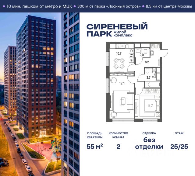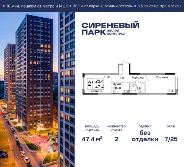 Продаётся просторная 2-комнатная квартира общей площадью 47.4 м² на 7 этаже в новом жилом комплексе "Сиреневый парк", расположенном в Восточном административном округе Москвы на улице Тагильская. Всего 10 минут ходьбы от станции метро "Бульвар Рокоссовского" и одноимённой платформы МЦК. Высококачественное монолитное строительство гарантирует сохранение тепла в доме, а наличие квартир с предчистовой и чистовой отделкой позволяет вам сэкономить время и сразу же переехать в свое жилье после покупки. Благодаря разнообразию планировок вы сможете выбрать идеальный вариант, соответствующий вашим предпочтениям и образу жизни. Предлагаются квартиры: - с просторными кухнями-гостиными, - с нишами для хранения вещей и отдельными гардеробными, - мастер-спальни с собственными санузлами, - большие комнаты с высокими потолками (2,9 м) и с увеличенными безопасными окнами (1,95 м) , которые наполнят ваш дом естественным светом; - с чистовой отделкой по двум дизайн-проектам на выбор; - с остекленными лоджиями и панорамными видами на лес. Каждая деталь в этом доме создана для вашего комфорта: - безбарьерная среда, - бесшумные скоростные лифты, - машиноместа в отапливаемом подземном паркинге и кладовые на -1 этаже с доступом из лифта, - развитая инфраструктура с супермаркетами, кафе, фитнес-клубами, салонами красоты и частным детским садом обеспечивает максимальное удобство жителям. В 300 метрах от ЖК расположен Национальный парк "Лосиный остров". Способы покупки: 100%, Trade-in, Семейная ипотека без наценки, стандартная ипотека. Запишитесь на просмотр в офис продаж и получите свою персональную скидку по акции Назови свою скидку. ЖК "Сиреневый парк" — гармония в деталях, совершенство в каждом моменте. Застройщик проекта - AFI Development.