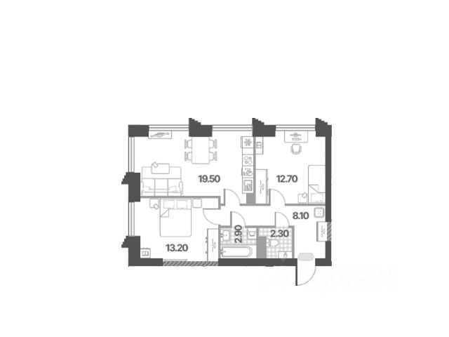 Планировка — спальня 13,7 м² и кухня-гостиная 20,8 м².