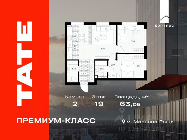 Представляем вашему вниманию прекрасную возможность стать обладателем 2-комнатной уютной и светлой квартиры 209, площадью 59.60 м², расположенной на 19 этаже в историческом районе Москвы. Квартира продаётся от застройщика ГК "КОРТРОС" одного из крупнейших девелоперов России. Основные преимущества, важные для вашего комфортного проживания: • Квартира с предчистовой отделкой (white box) - идеальное решение, чтобы воплотить собственное видение дизайна; • Высота потолков - 3.12 м, панорамные окна наполняют пространство естественным светом, открывая вид на Парк Останкино/ВДНХ, Парк сокольники; • Угловое остекление, обеспечивает максимальное проникновение естественного света и расширяет панорамный обзор; • В квартире предусмотрены два санузла - для максимального комфорта каждого члена семьи; • Мастер-спальня - возможность создания личного пространства для отдыха и работы; • По желанию можно приобрести парковочное машиноместо. TATE - премиальный жилой комплекс, вдохновленный эстетикой современного искусства. Две башни TATE - образцы архитектурного минимализма, триумф функциональной простоты и отсутствия вычурности. Трехуровневое благоустройство от авторов столичного "Музеона", SPA и фитнес только для резидентов, а также панорамный лаунж на высоте 140 метров, откуда открывается впечатляющий вид на вечернюю Москву. Важной особенностью проекта является продуманная инфраструктура. На территории TATE будут расположены кафе и рестораны, где ранним утром можно насладиться горячей чашечкой кофе, а вечер провести за ужином в тихой расслабляющей атмосфере на открытой веранде. После рабочего дня непременно стоит расслабиться в SPA, расположенном на территории ЖК. Для любителей спорта предусмотрен фитнес-центр с бассейном. Для тех, кто ценит искусство на территории ЖК будет действовать арт пространство со сменной экспозицией и лаунж с панорамным видом на 39 этаже. Внутренний двор превращен в тихое зеленое пространство с арт-объектами, прогулочными аллеями и уютными зонами отдыха. Здесь приятно проводить время с семьей, встречать друзей и просто наслаждаться состоянием покоя. TATE - это новый уровень жизни рядом с ЦАО: • 5 минут пешком до метро Марьина роща; • 15 минут пешком до парков "Сокольники"и "Останкино"; • Сады и школы в шаговой доступности; • 10-15 минут на автомобиле до центра Москвы и Цветного бульвара, 20 минут до Москва-Сити. Архитектура, комфорт и вдохновение - все, чтобы каждый Ваш день начинался красиво.