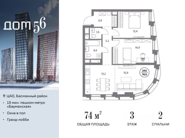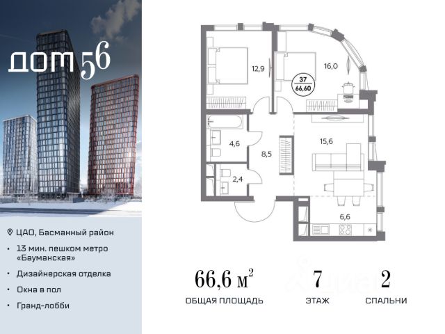 В премиум-квартале "Дом 56" на Бауманской напрямую от девелопера ГК "Галс-Девелопмент" представлена 2-комнатная квартира на 2 этаже общей площадью 62.70 м². Квартира предлагается без отделки, со свободной планировкой. Пространство позволяет воплотить дизайн - проект в соответствии с Вашими предпочтениями. "Дом 56" - расположен в Басманном районе на ул. Фридриха Энгельса, всего в 12-15 минутах пешком от станций метро "Бауманская" и "Электрозаводская". Рядом с премиум-кварталом находятся важные городские магистрали - ТТК, набережная реки Яузы и Бакунинская улица, переходящая в Спартаковскую и Маросейку. Архитектурный стиль "Дома 56" - параметрический минимализм. Футуристические фасады квартала с "эффектом закручивания" словно вращаются вокруг своей оси. Динамичный образ башен дополняет эффектное остекление - окна в пол будут в каждой квартире. "Дом 56" станет органичным продолжением современной научно-креативной среды Басманного района: - Развитое окружение - десятки различных точек притяжения; - Близость престижных вузов: МГТУ, МЭИ и Британская высшая школа дизайна; - Соседство с Технологической долиной и всем необходимым для запуска стартапа; - Набережные и парки для спорта и отдыха. "Дом 56" оснащён первоклассными инженерными системами. Входы на территорию, в здание и паркинг оборудованы системой контроля и управления доступом. С любого этажа в лобби и паркинг спускаются быстрые и бесшумные лифты премиального бренда. Во внутреннем приватном дворе будет создано пространство в бионическом стиле с лаунж-зонами, подвесными качелями, детскими плейхабами для разных возрастов, площадками для спорта и отдыха в окружении зелени. На двух подземных уровнях предусмотрен подземный паркинг и кладовые помещения. Купить 2-комнатную квартиру в ипотеку в новостройке рядом с метро Электрозаводская.