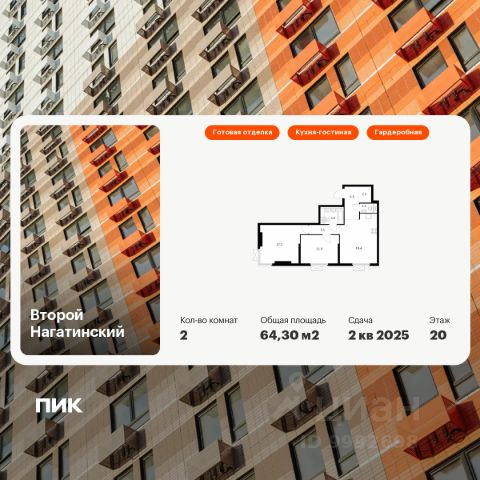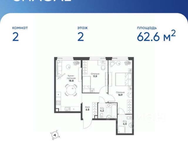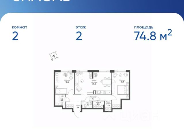 Планировочное решение: 2 санузла, 2 спальни площадью- 10,3 и 10 кв.м, просторная кухня-гостиная - 35,3 кв.м, гардеробная, 2 лоджии .
