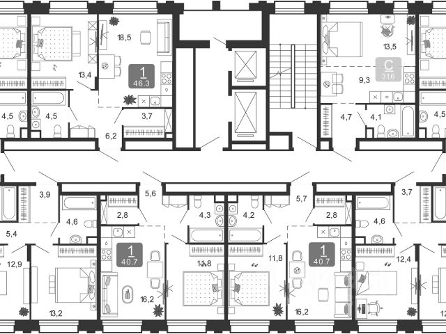 Огромная кухня-гостиная - 18,5 м2, уютная спальня - 13,4 м2, гардеробная комната - 3,7 м2 для организации хранения вещей, большой с/у - 4,5м2.